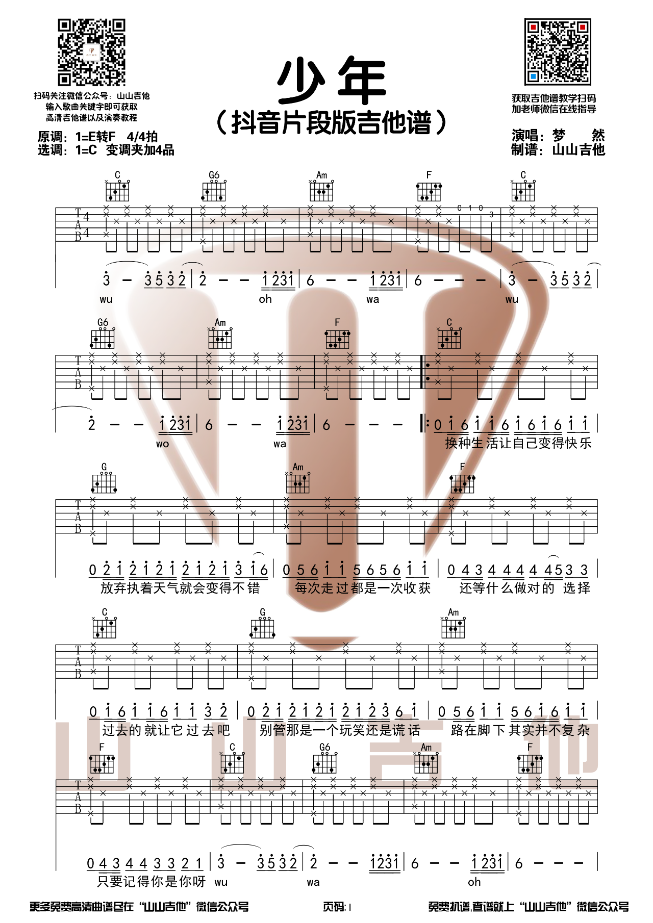 曲谱介绍: 梦然《少年》吉他弹唱谱,采用C调指法编配,共有2张高清图谱,免翻页排版设计。