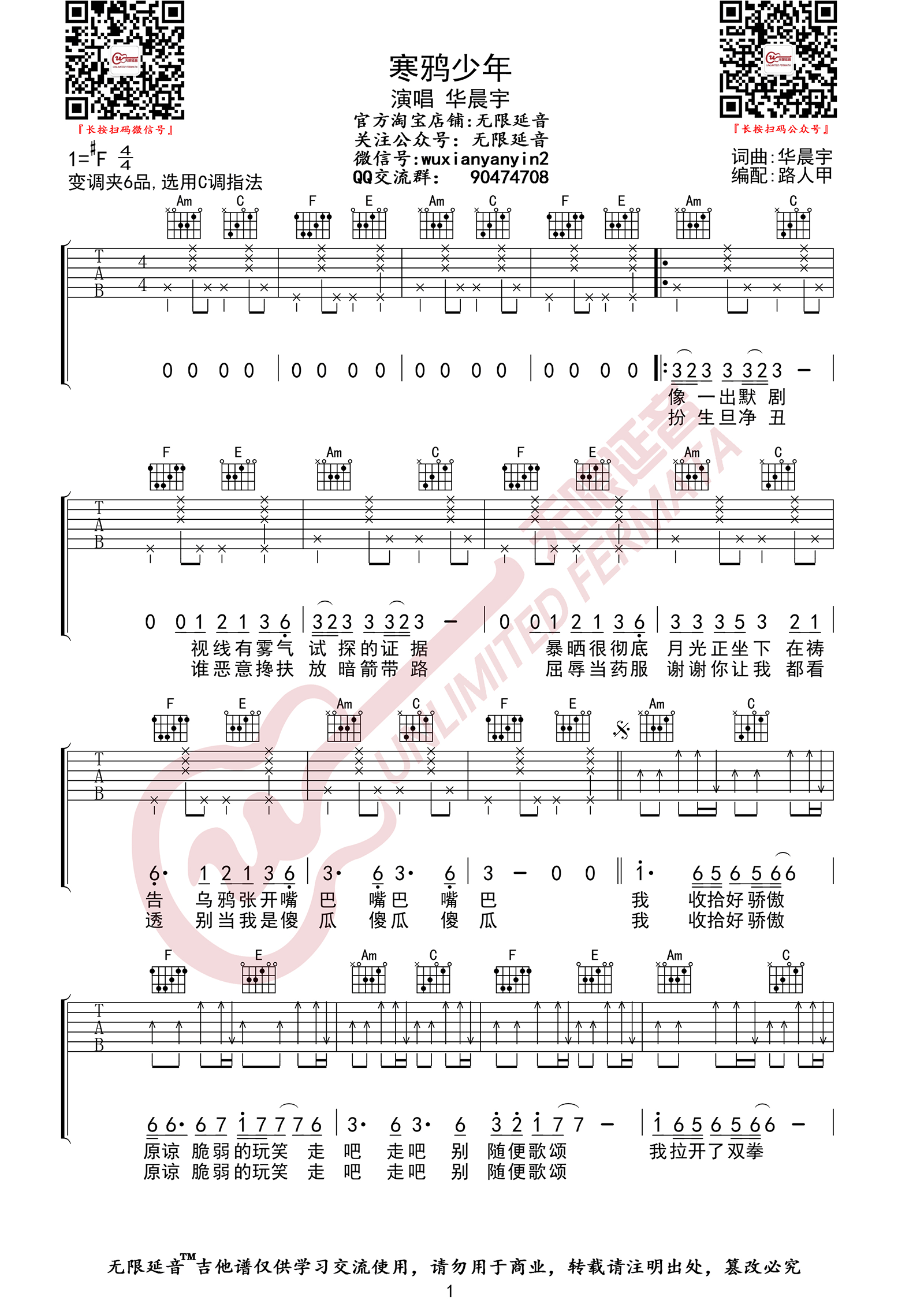 曲谱介绍: 华晨宇《寒鸦少年》吉他弹唱谱,采用C调指法编配,共有3张高清图谱。