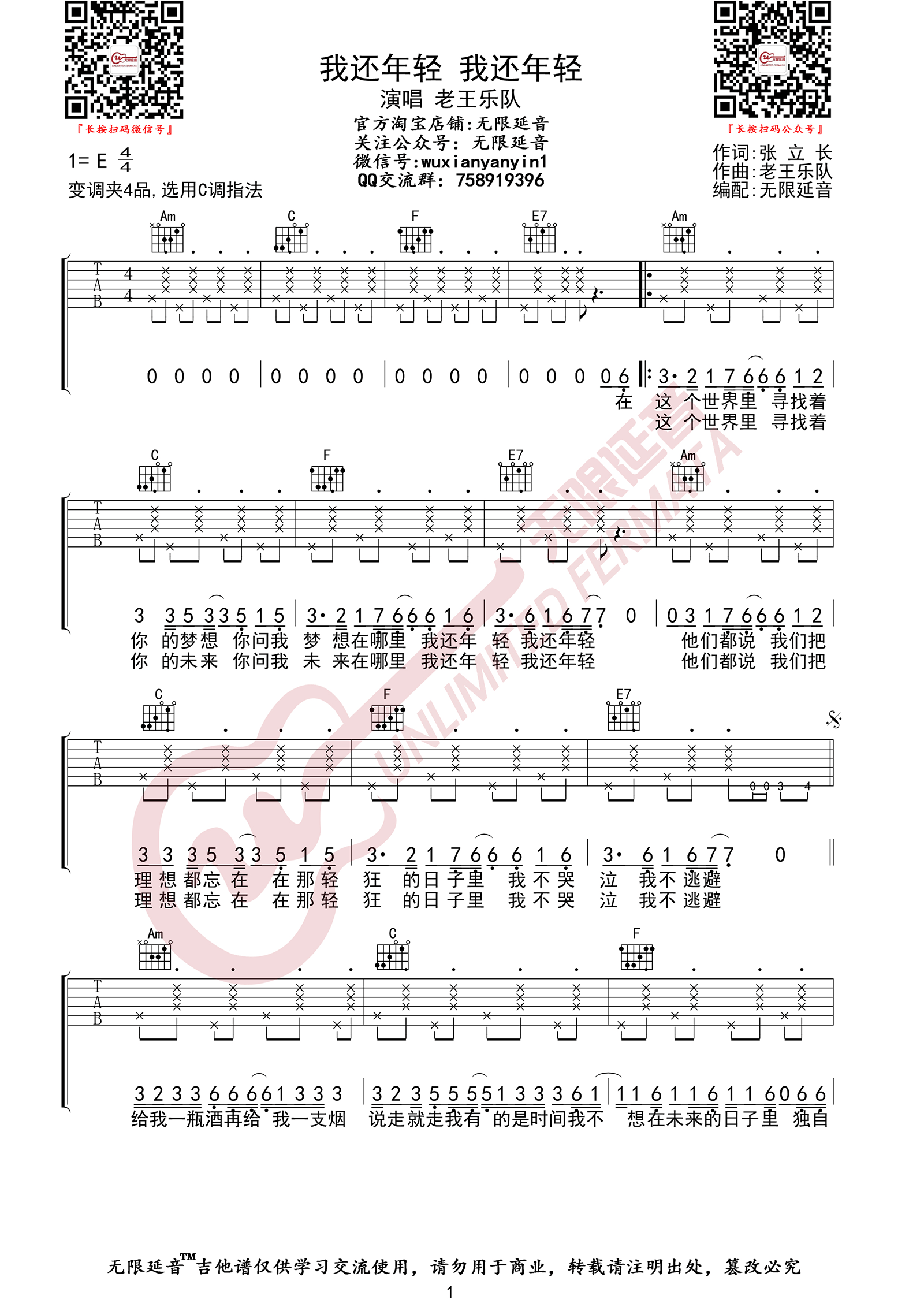 曲谱介绍: 老王乐队《我还年轻我还年轻》吉他弹唱谱,采用C调指法编配,共有3张高清图谱。