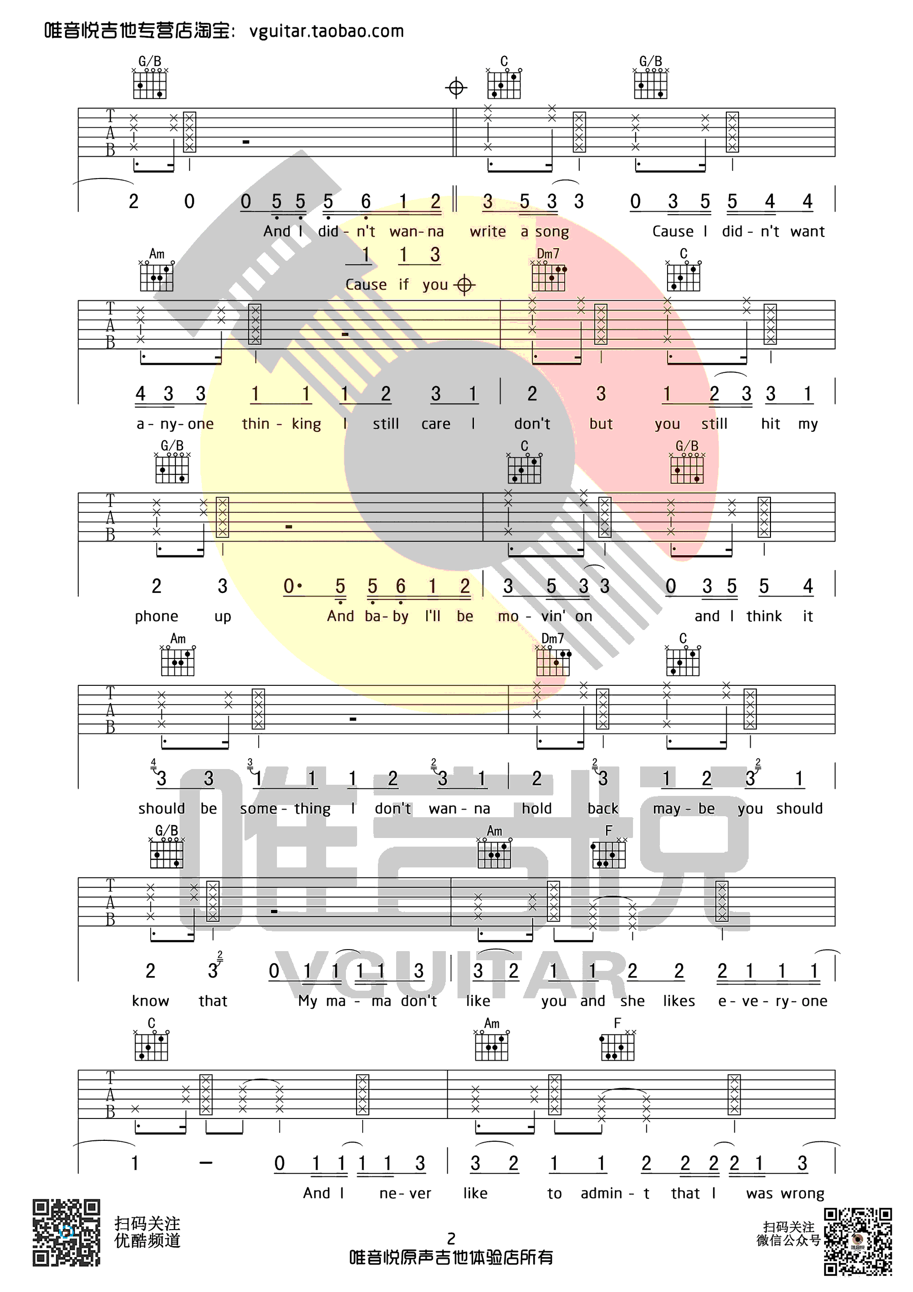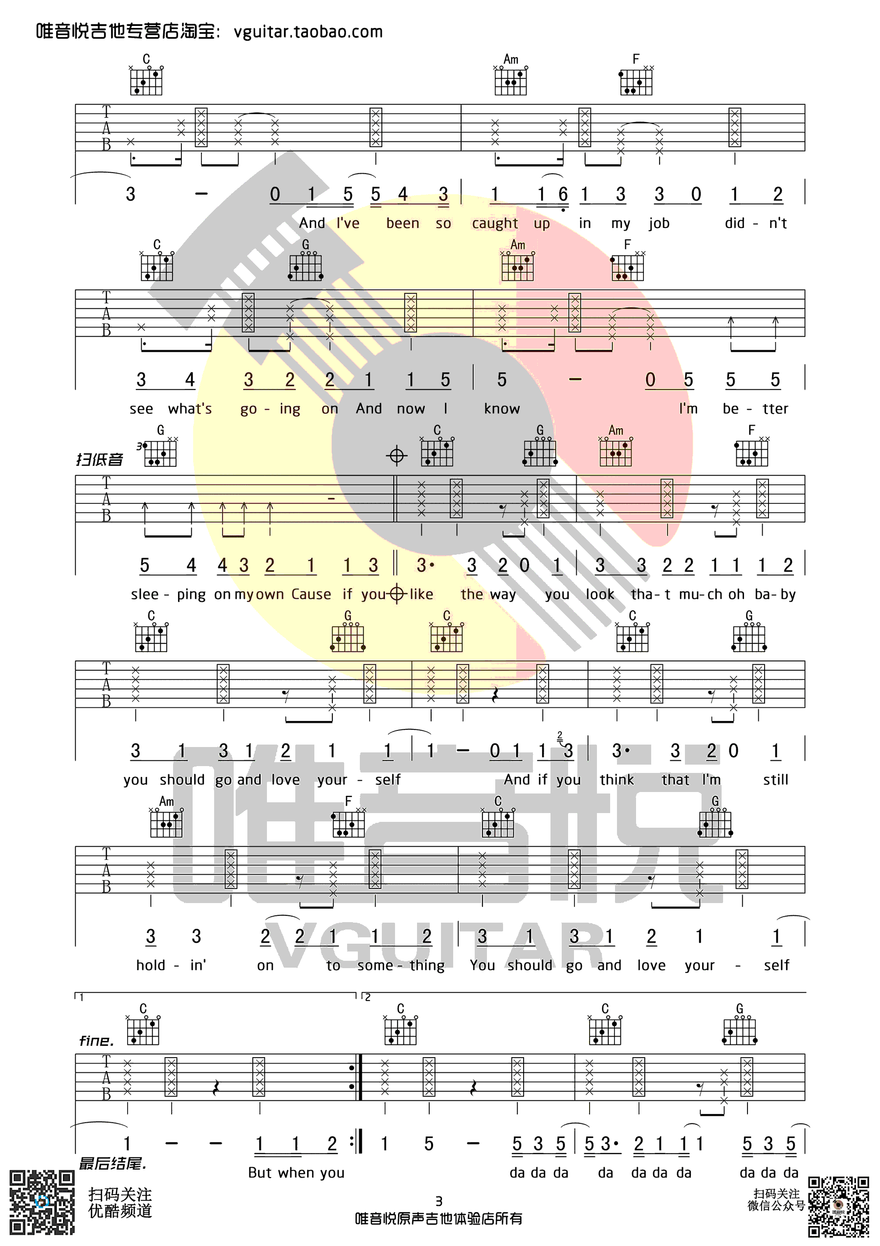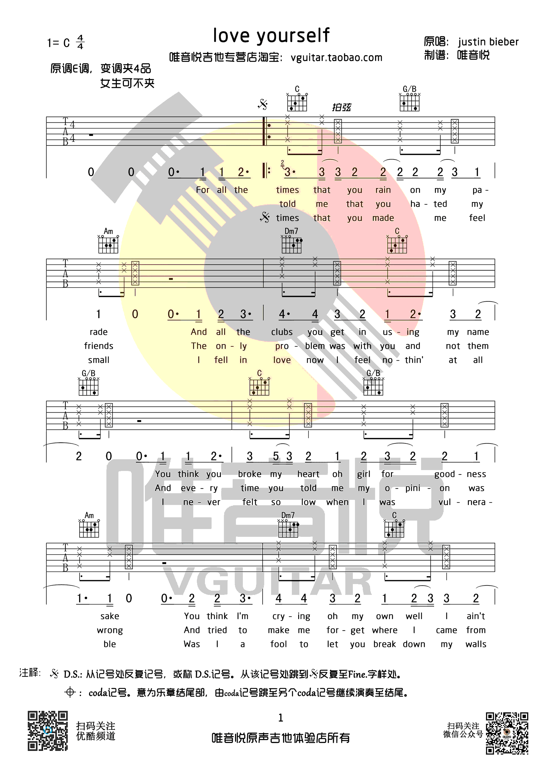 曲谱介绍: Justin《LoveYourself》吉他弹唱谱,采用C调指法编配,共有4张高清图谱。