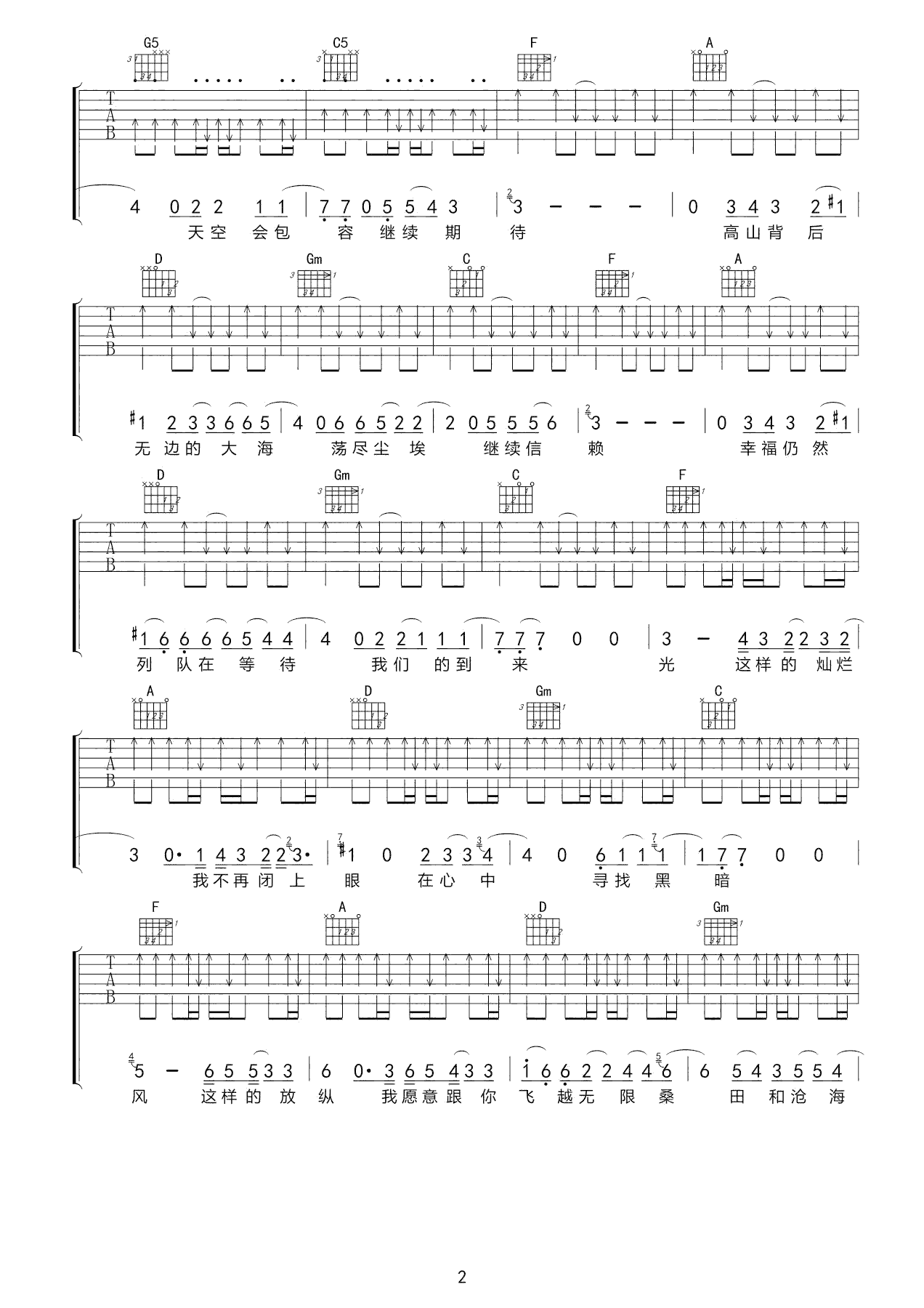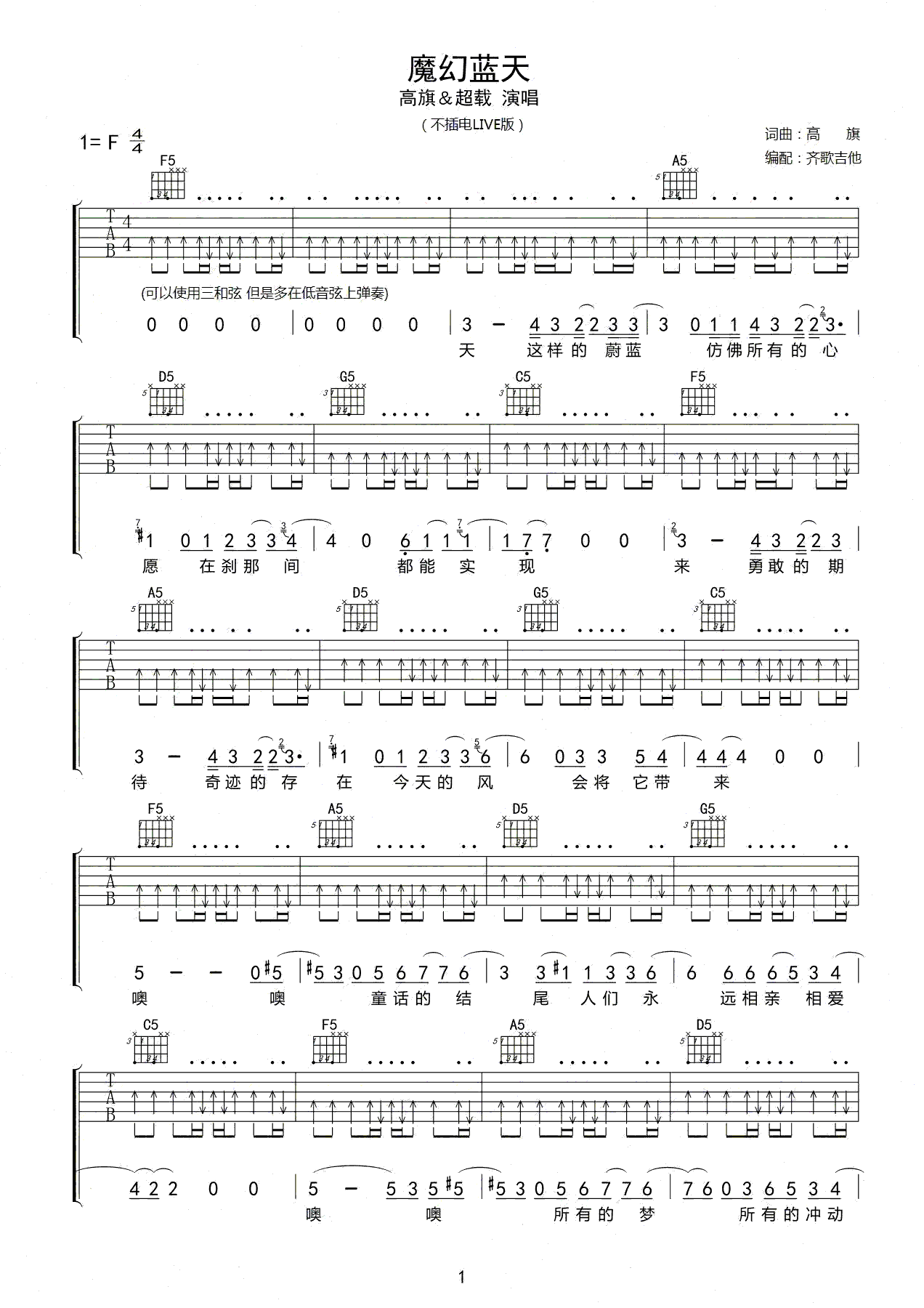 曲谱介绍: 超载乐队《魔幻蓝天》吉他弹唱谱,采用F调指法编配,共有5张高清图谱。