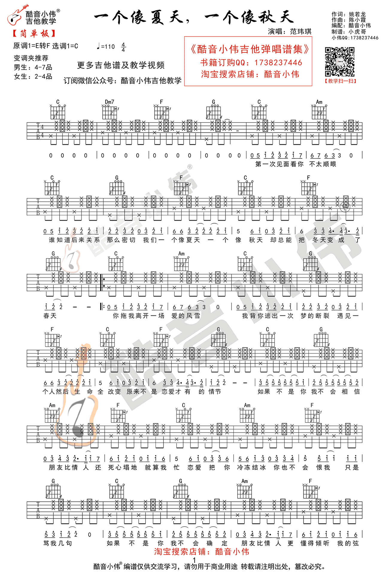 曲谱介绍: 范玮琪《一个像夏天一个像秋天》吉他弹唱谱,采用C调指法编配,共有2张高清图谱,免翻页排版设计。