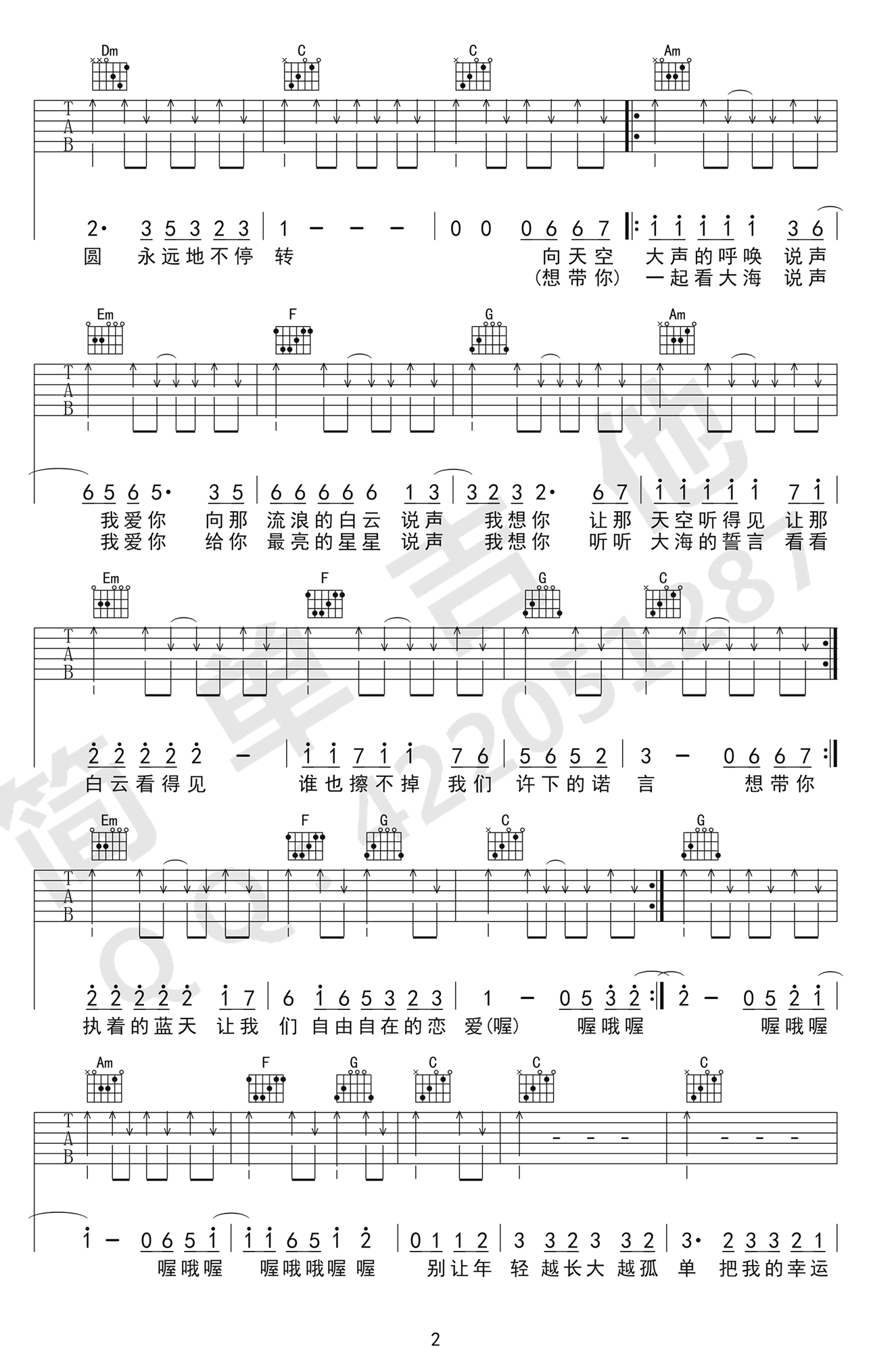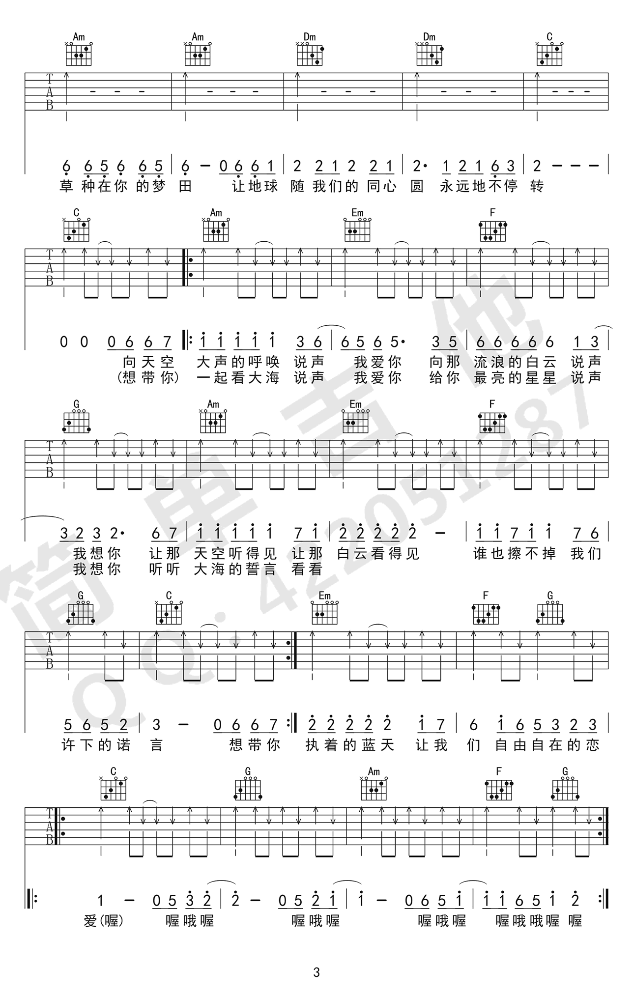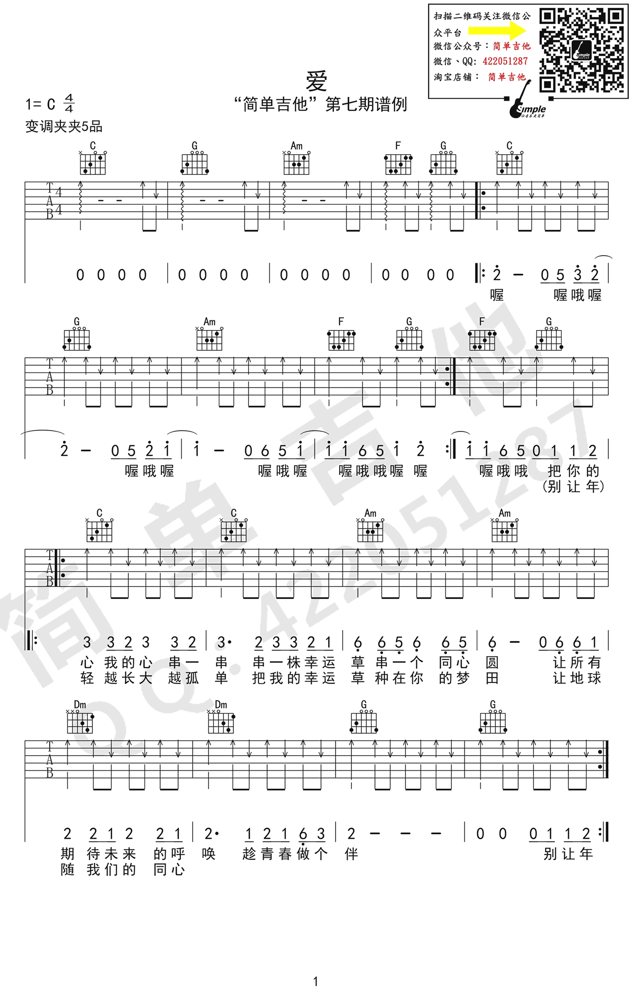 曲谱介绍: 小虎队《爱》吉他弹唱谱,采用C调指法编配原版,共有3张高清图谱。