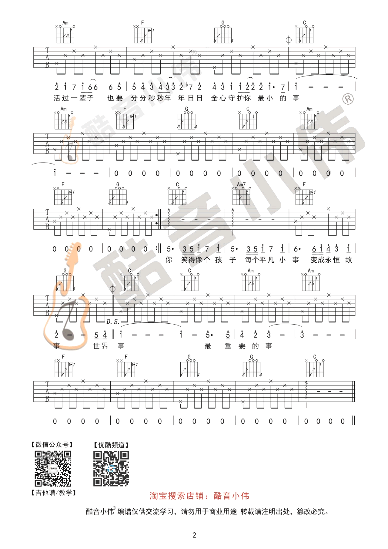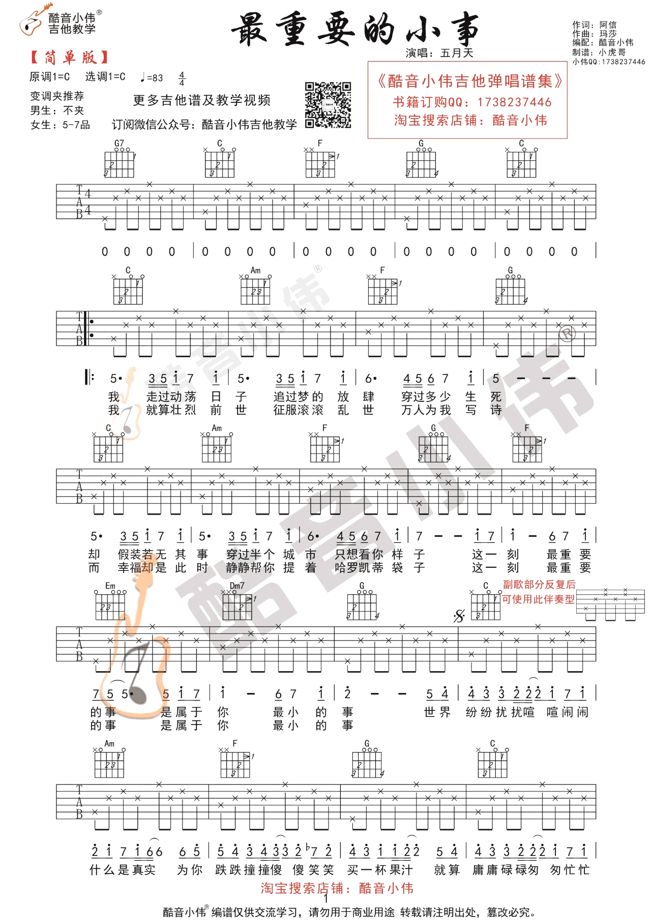 曲谱介绍: 五月天《最重要的小事》吉他弹唱谱,采用C调指法编配,共有2张高清图谱,免翻页排版设计。