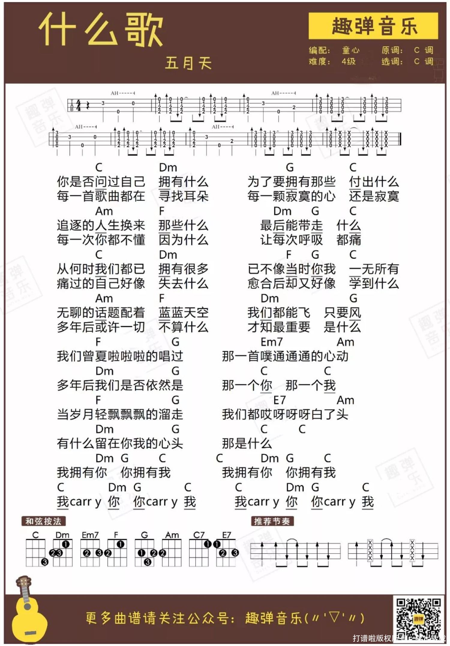 曲谱介绍: 《什么歌》尤克里里弹唱谱 阳光、感动与暖心,是五月天音乐里标志性的主题。新歌「什么歌」延续了五月天的风格,爽朗轻快的旋律很适合齐声合唱。 新的一年,用《什么歌》鼓励大家体悟岁月流动的当下,获得继续向前的勇气。 「捉妖记」充满欢乐、暖心与感动,是一部很适合春节假期和家人一起看的电影。而主题曲「什么歌」,也是一首很适合在KTV里一起大合唱的阳光暖心之歌。 歌曲讲述相互陪伴的路途,轻轻询问人生最重要的是什么,温暖细腻,触动人心,同时又充满积极乐观的力量。