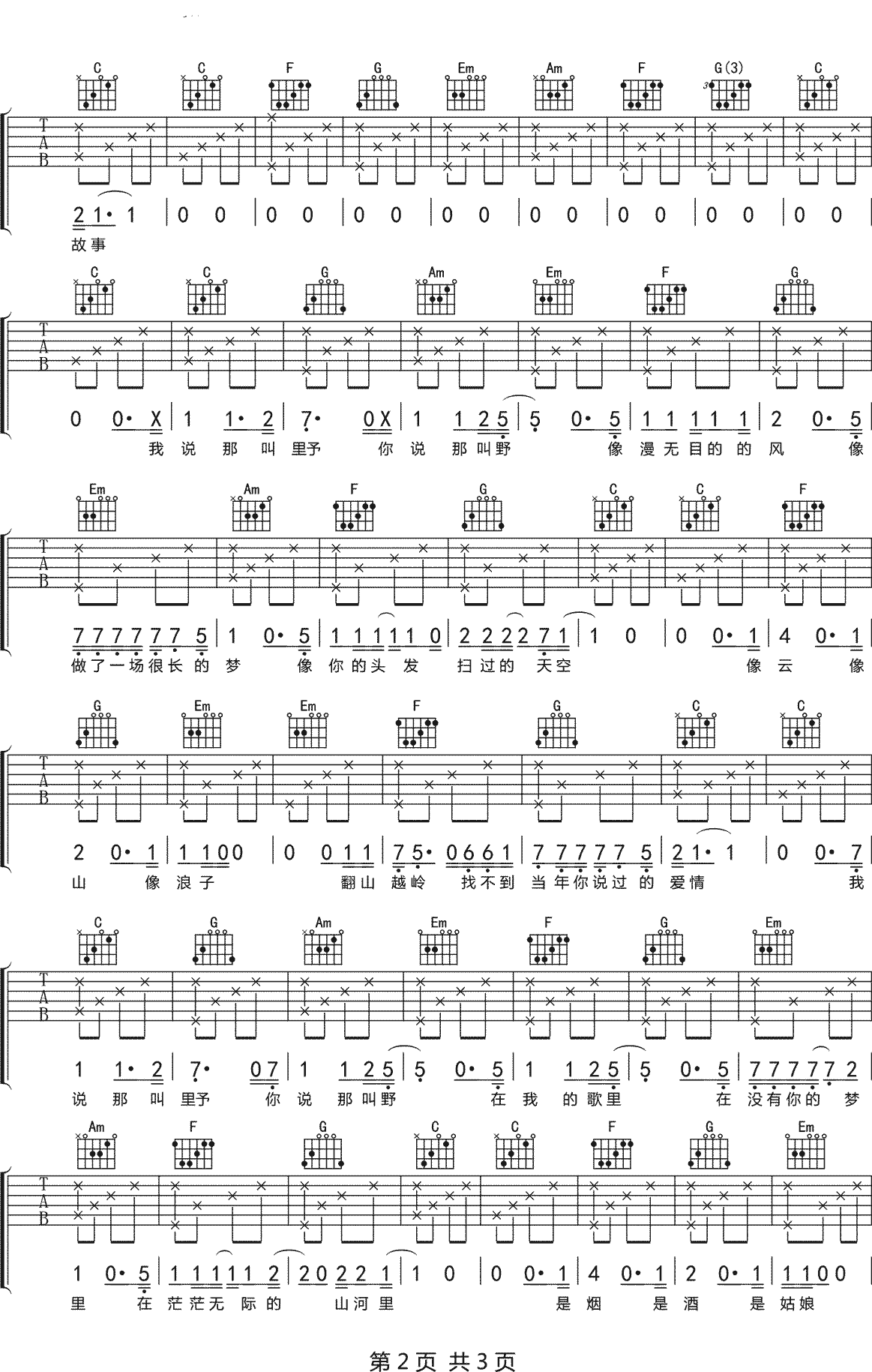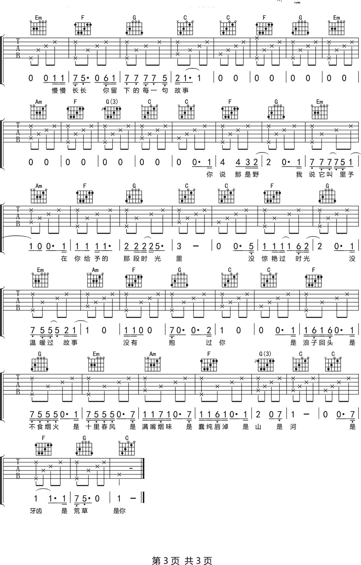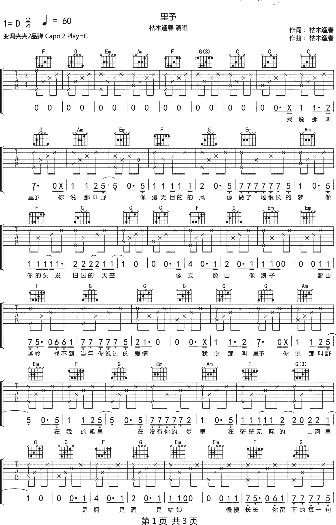 曲谱介绍: 枯木逢春《里予》吉他弹唱谱,采用C调指法编配原版,共有3张高清图谱。