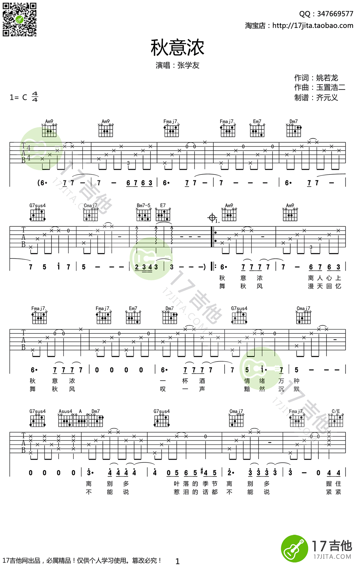 曲谱介绍: 张学友《秋意浓》吉他弹唱谱,采用C调指法编配,共有2张高清图谱,免翻页排版设计。