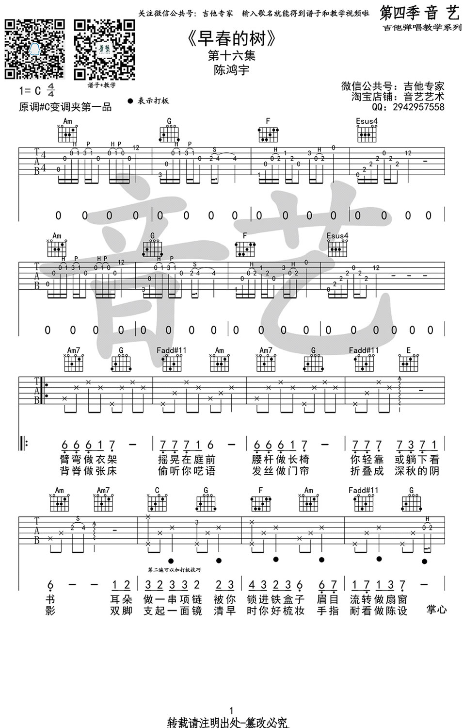 曲谱介绍: 陈鸿宇《早春的树》吉他弹唱谱,采用C调指法编配原版,共有3张高清图谱。