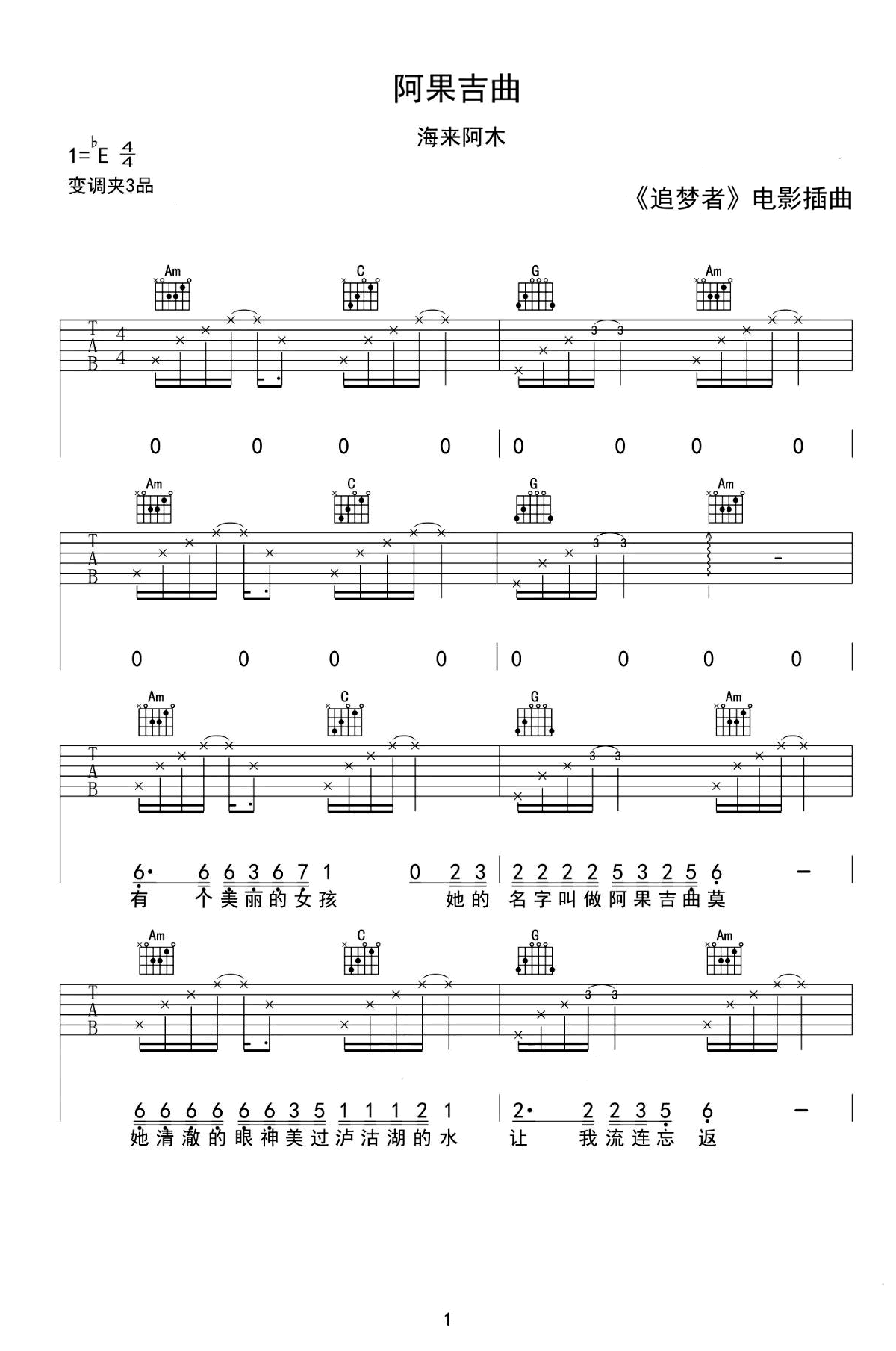 曲谱介绍: 海来阿木《阿果吉曲》吉他弹唱谱,采用C调指法编配,共有6张高清图谱。