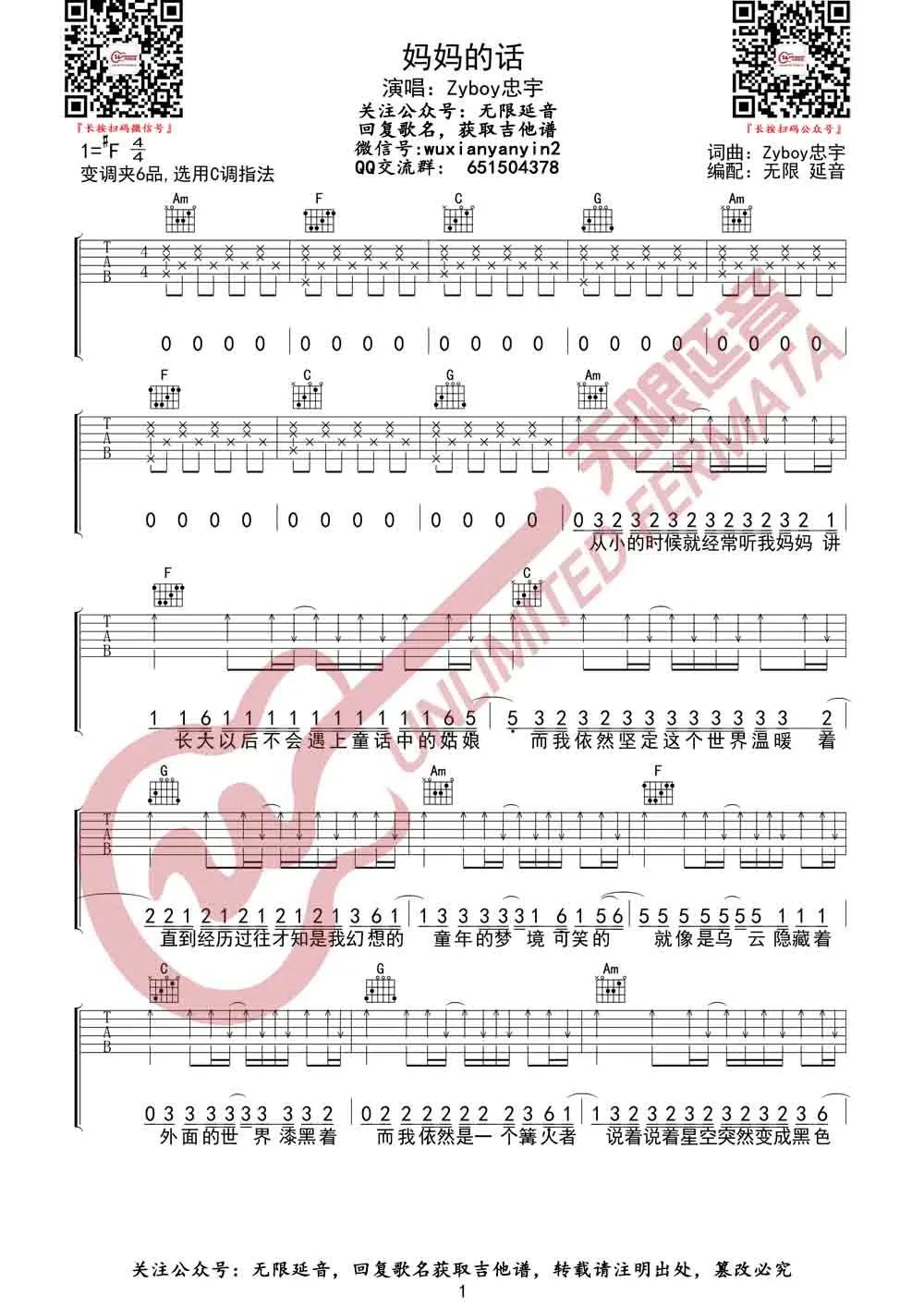 曲谱介绍: Zyboy忠宇《妈妈的话》吉他弹唱谱,采用C调指法编配原版,共有3张高清图谱。