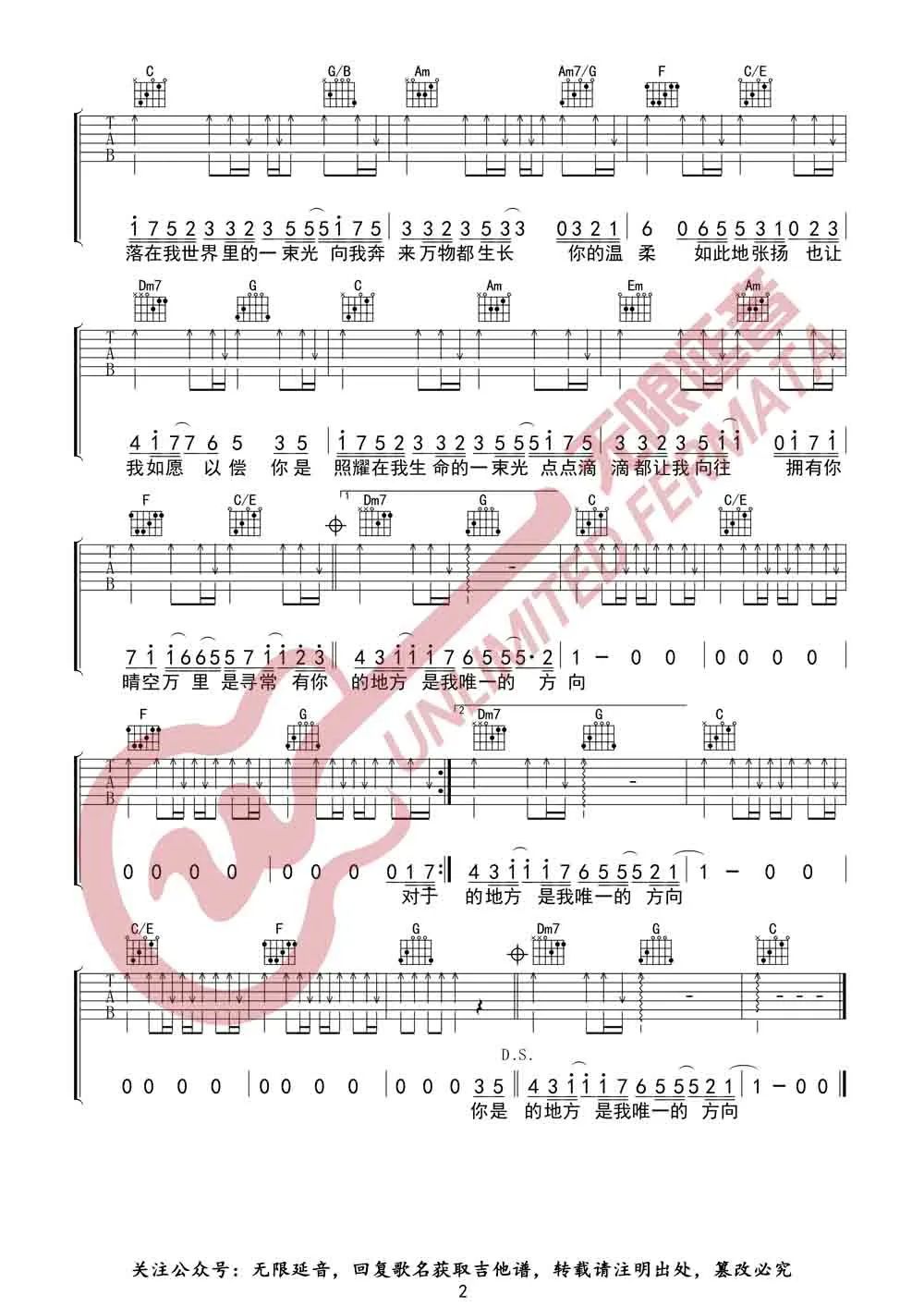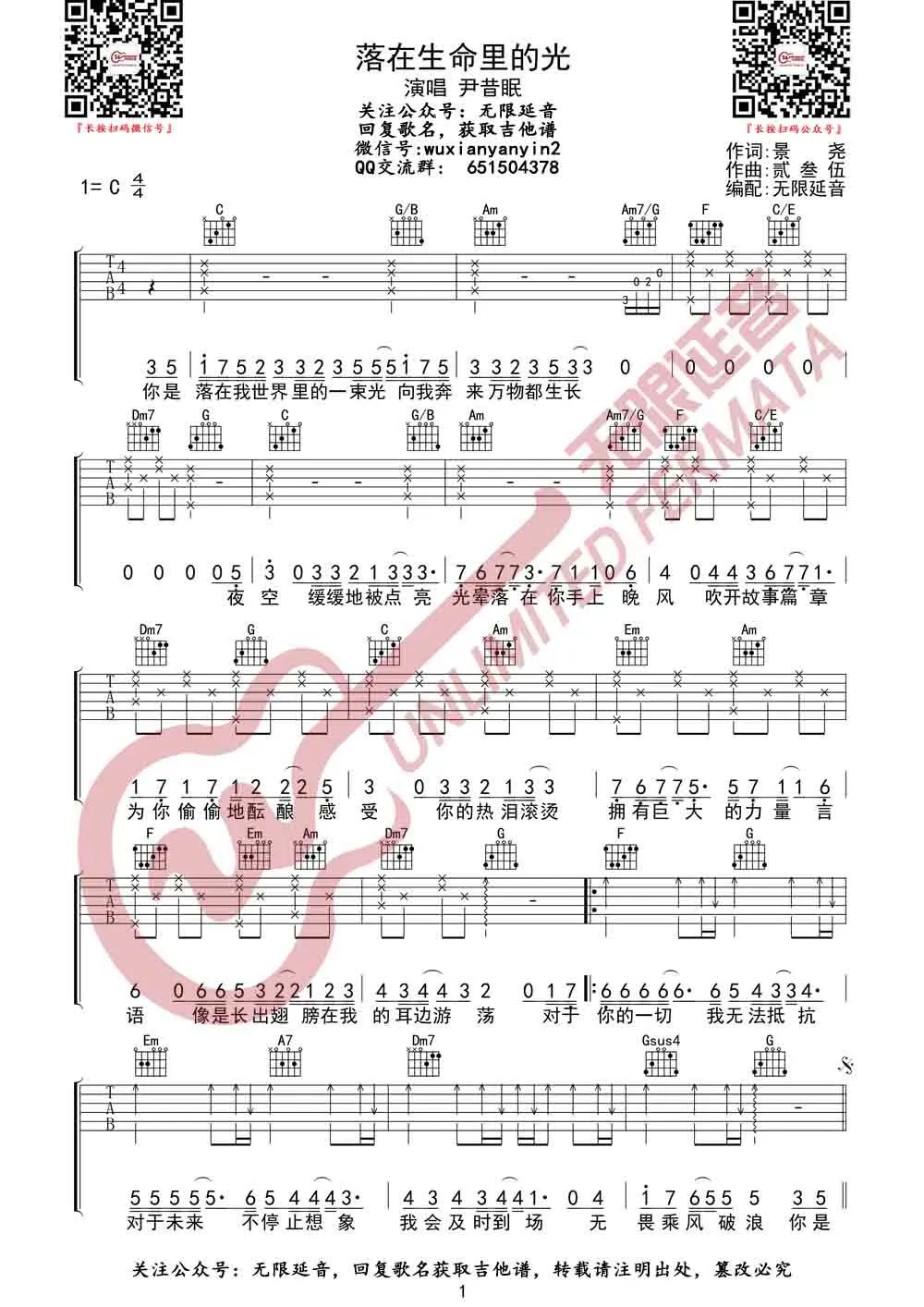 曲谱介绍: 尹昔眠《落在生命里的光》吉他弹唱谱,采用C调指法编配,共有2张高清图谱,免翻页排版设计。