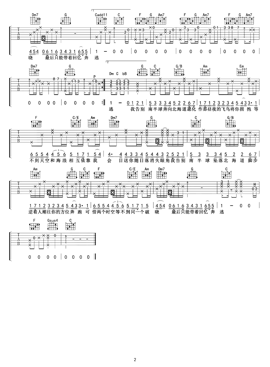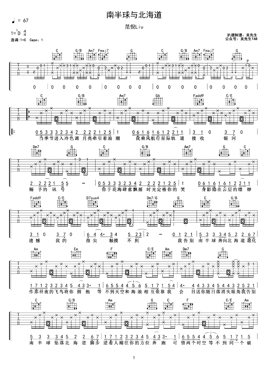 曲谱介绍: 范倪Liu《南半球与北海道》吉他弹唱谱,采用C调指法编配,共有2张高清图谱,免翻页排版设计。