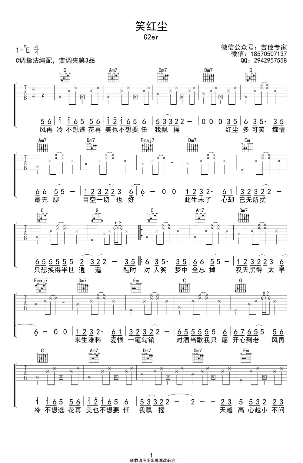 曲谱介绍: 《笑红尘》吉他弹唱谱,原调降E,选用C调指法编配,变调夹夹第三品,两张图片六线谱。