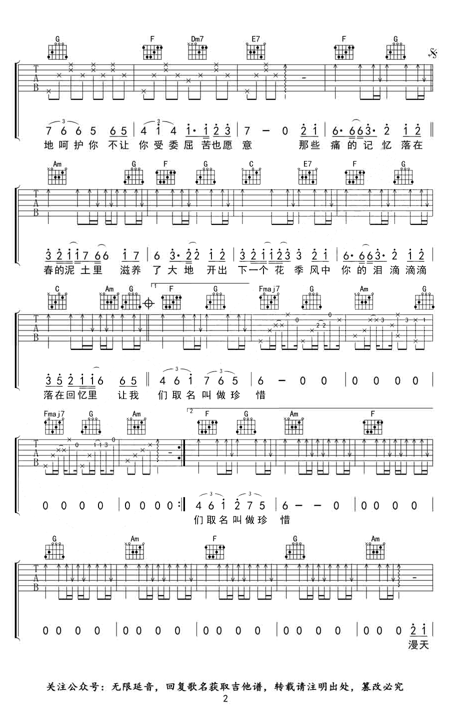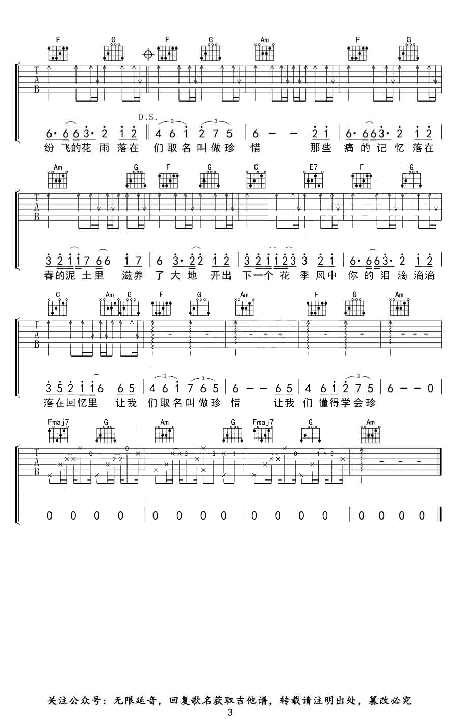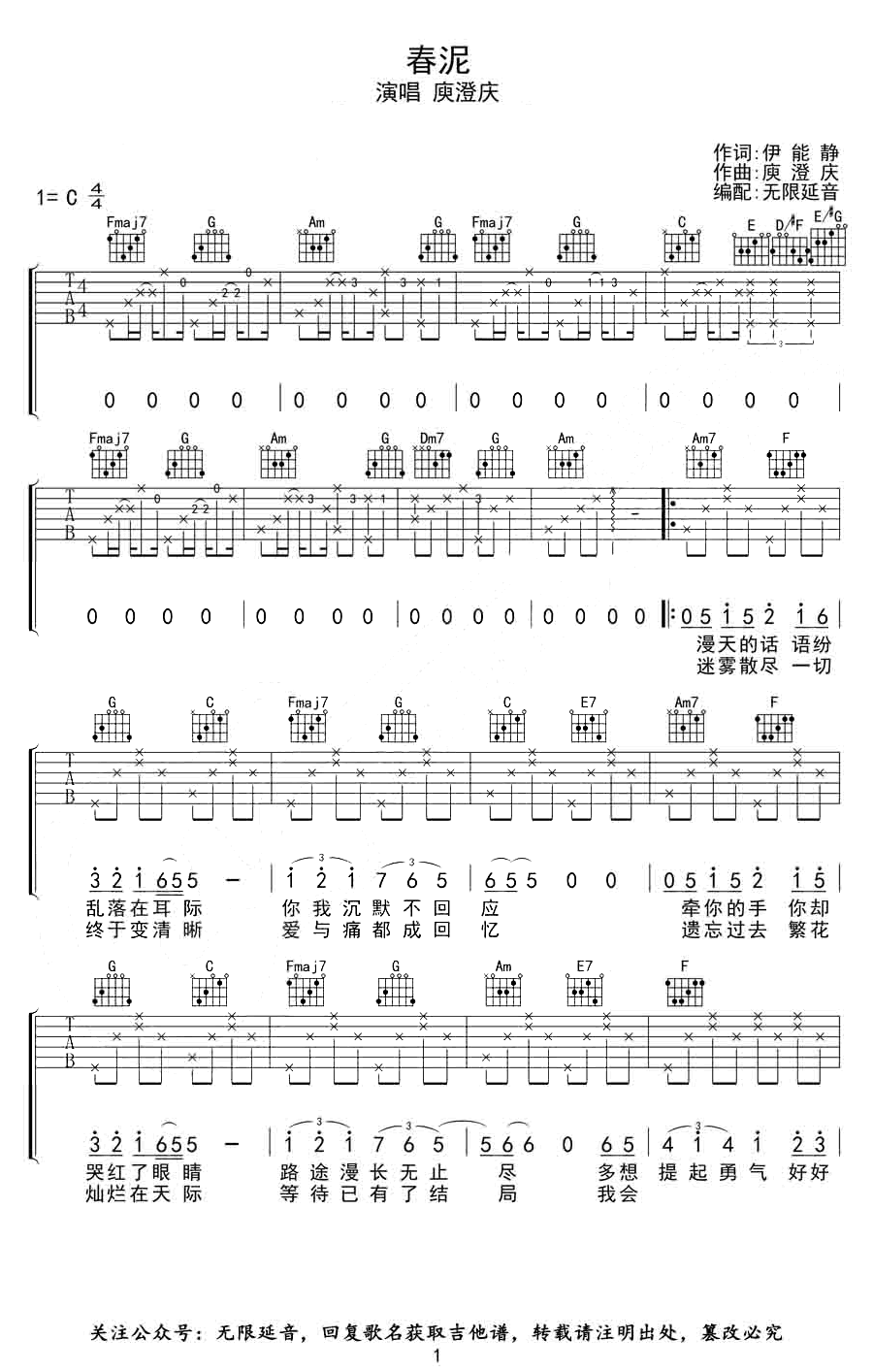 曲谱介绍: 《春泥》吉他弹唱谱,C调和弦指法编配,三张图片六线谱。
