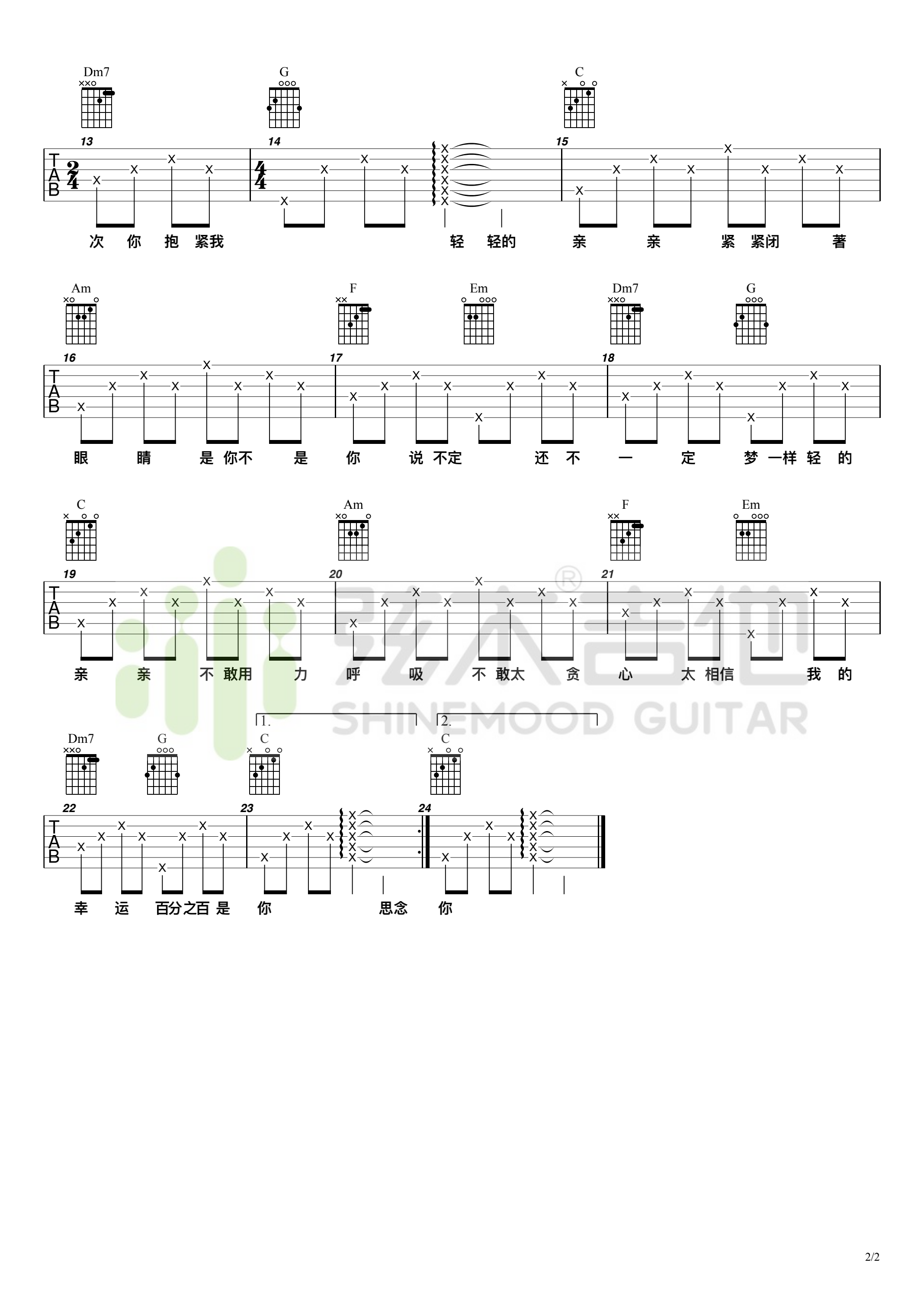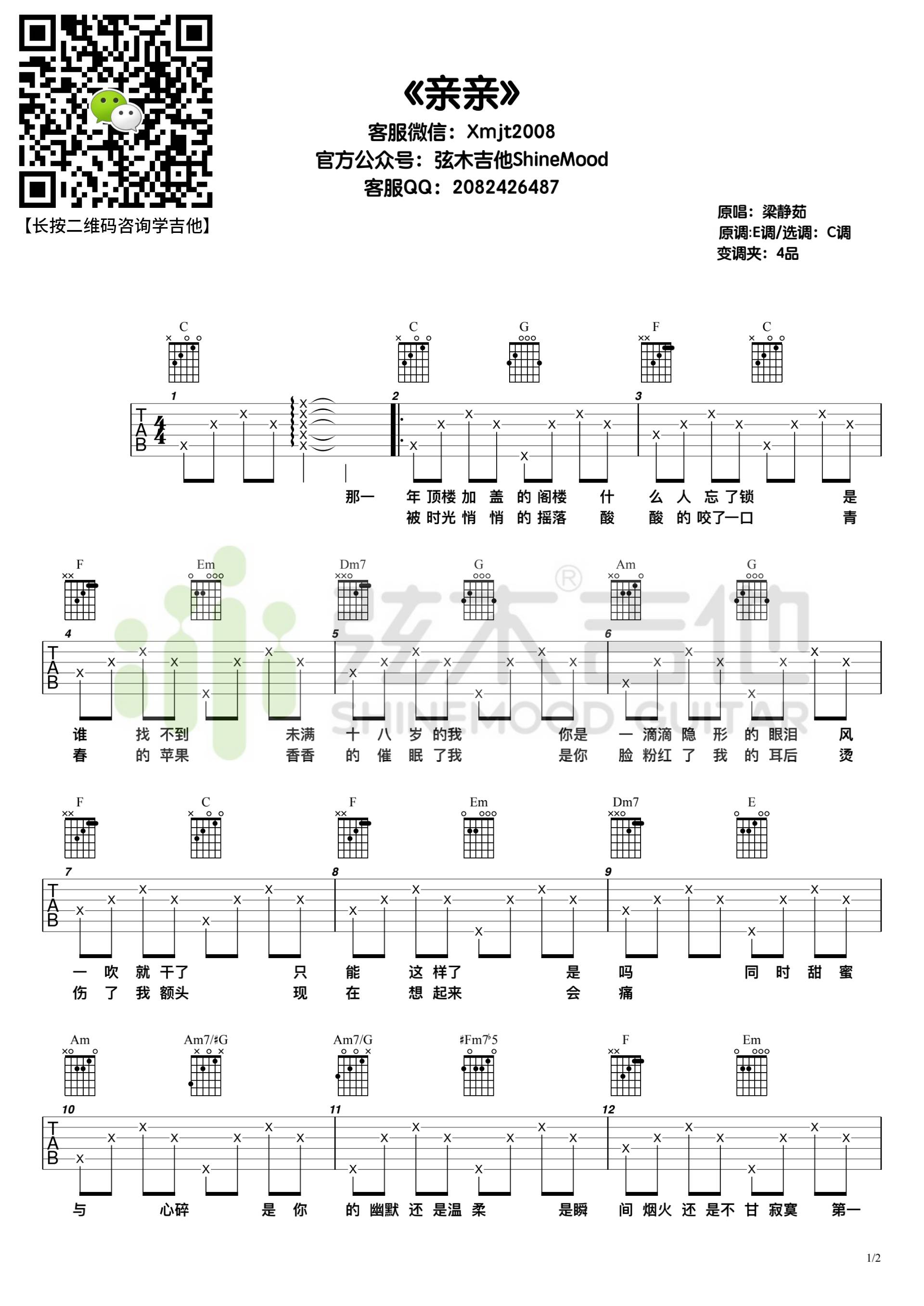 曲谱介绍: 梁静茹《亲亲》吉他弹唱谱,采用C调指法编配,共有2张高清图谱,免翻页排版设计。