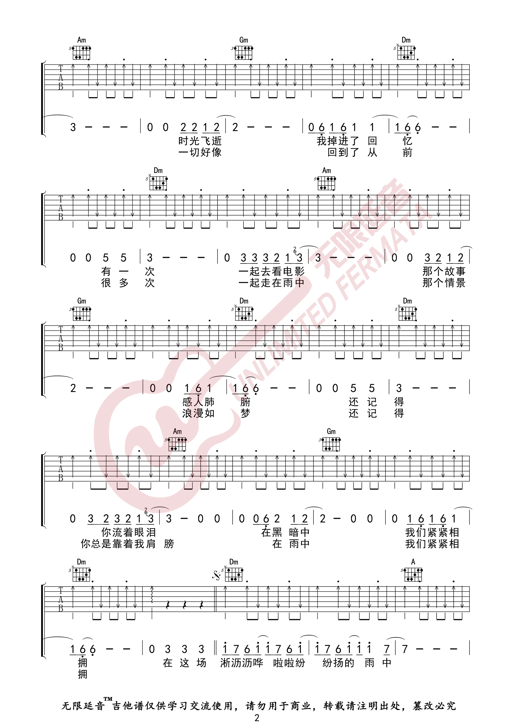 曲谱介绍: 汪峰《在雨中》吉他弹唱谱,采用F调指法编配原版,共有3张高清图谱。