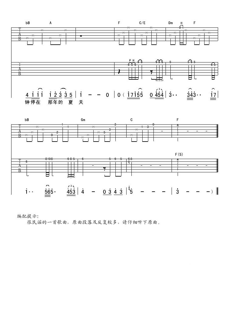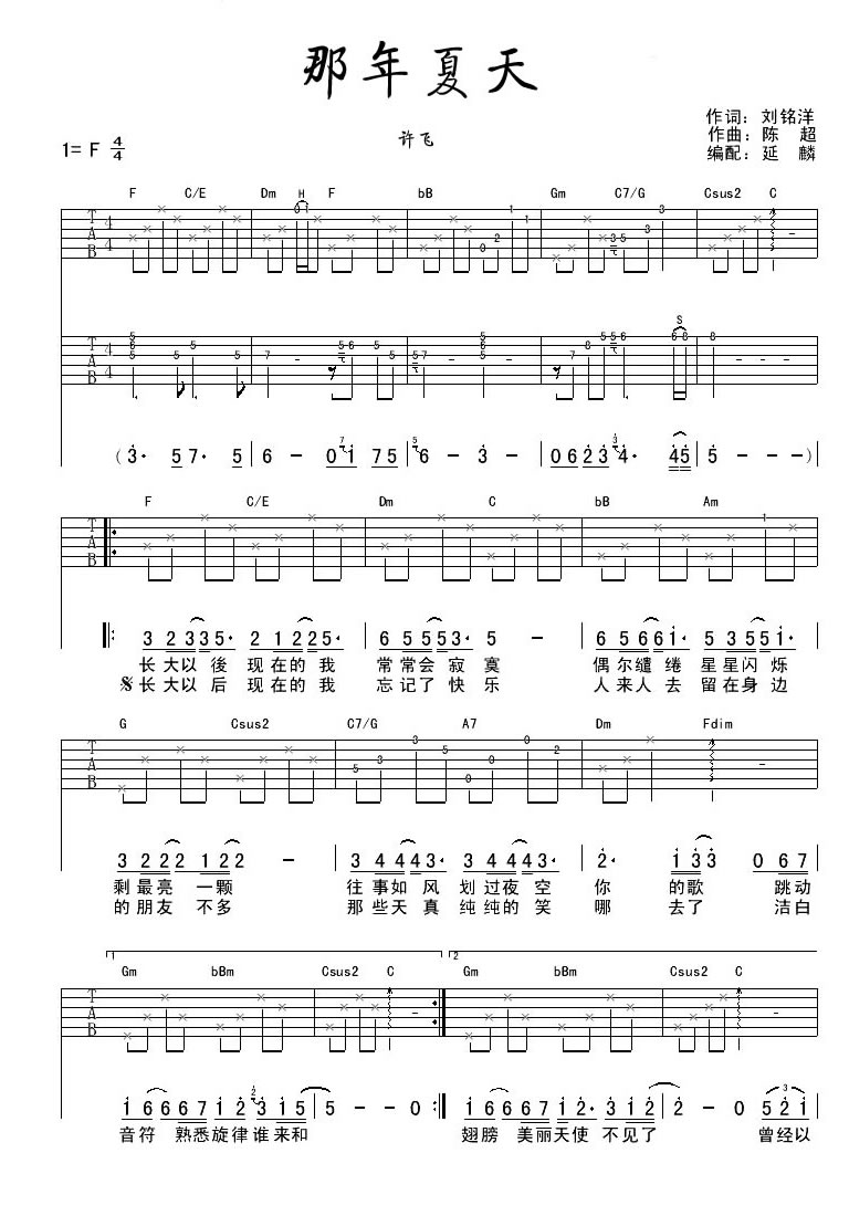 曲谱介绍: 许飞《那年夏天》吉他弹唱谱,采用F调指法编配原版,共有3张高清图谱。