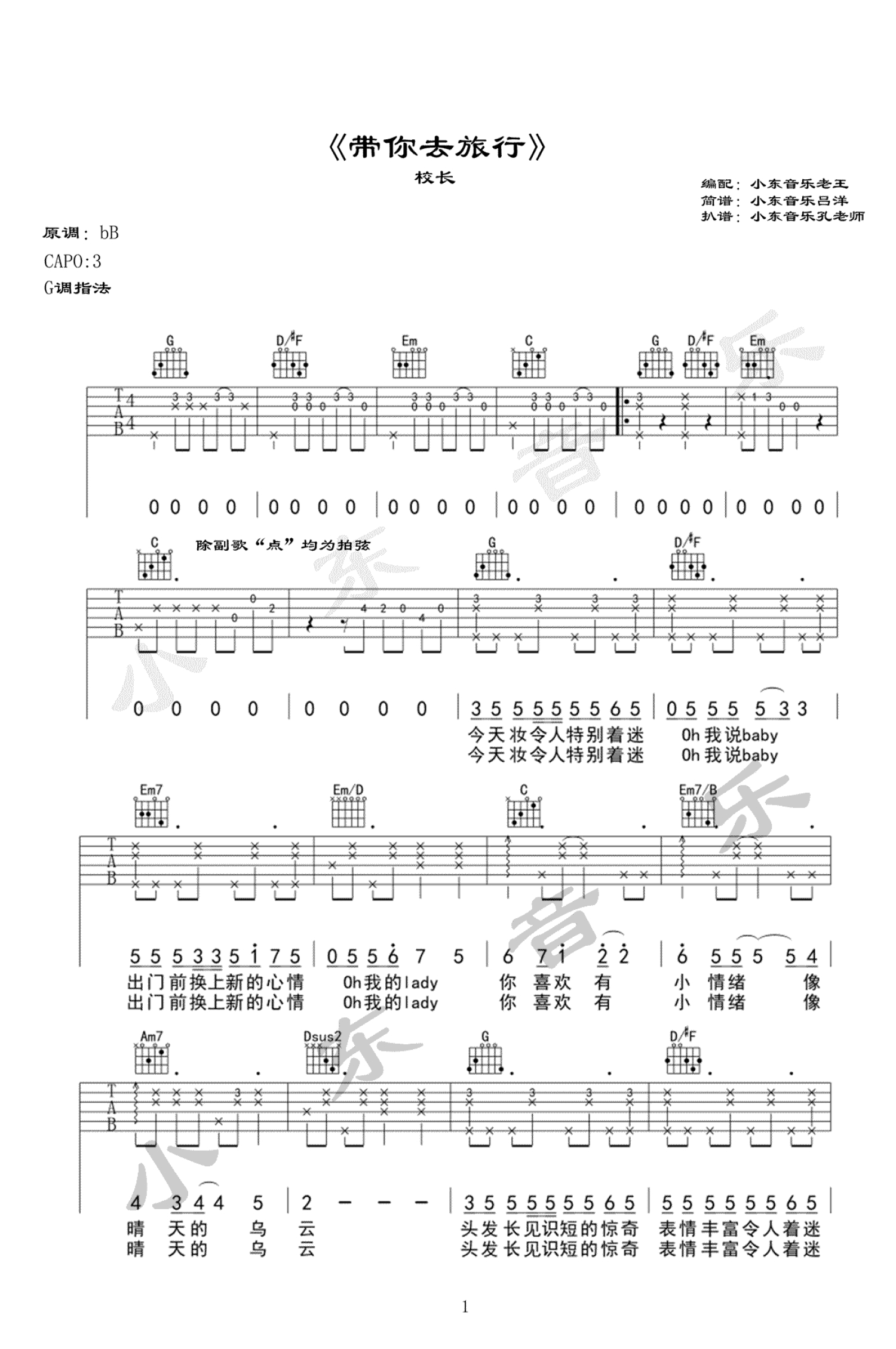 曲谱介绍: 带你去旅行吉他谱,歌曲原调降B,变调夹夹三品,G调指法。校长演唱,带你去旅行吉他弹唱谱,一首轻快动听的歌曲,浪漫的事情莫过带上你爱的另一半一起去旅行,一首洋溢甜蜜恋爱味道的情歌,学起来唱给你喜欢的人听吧。