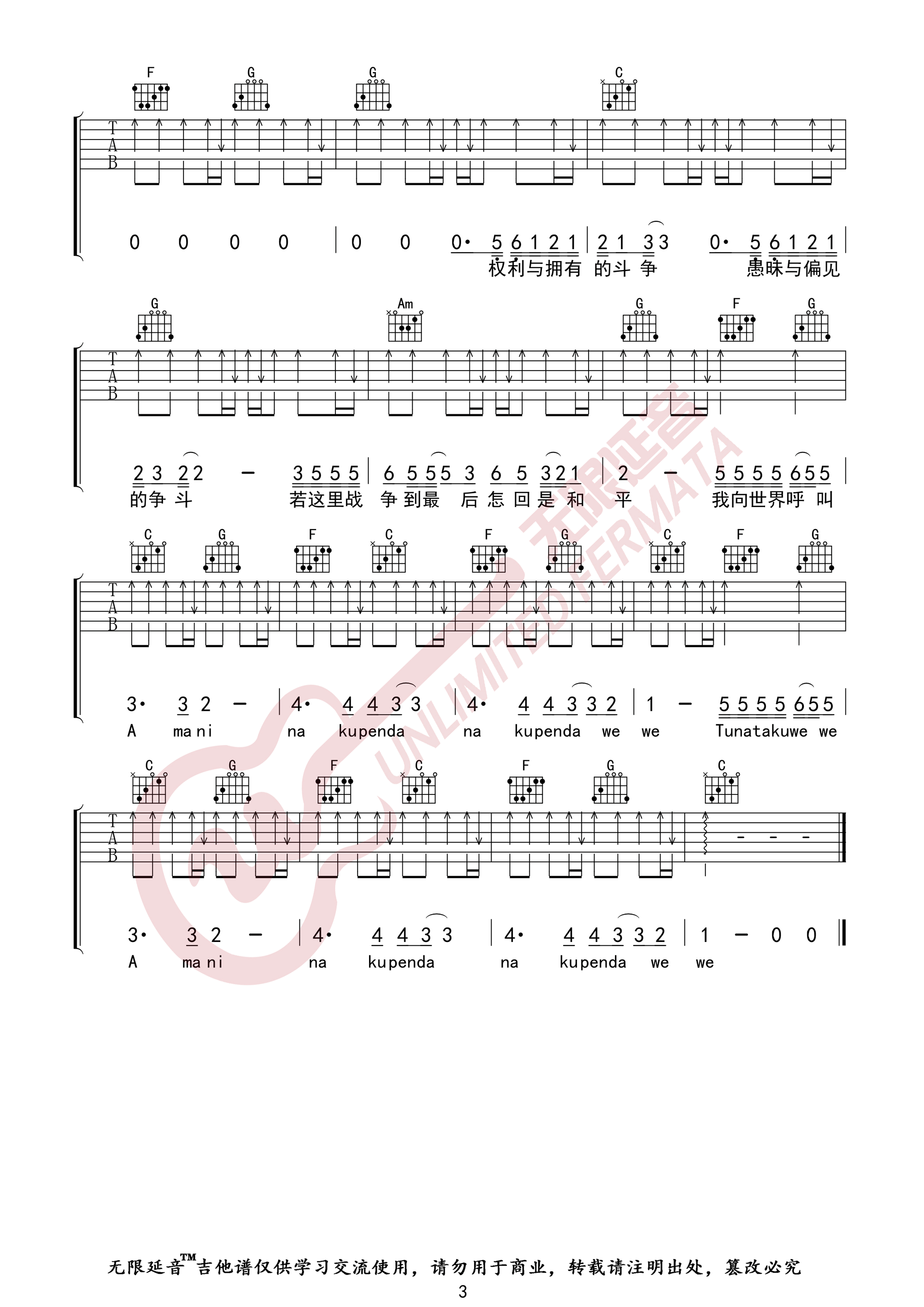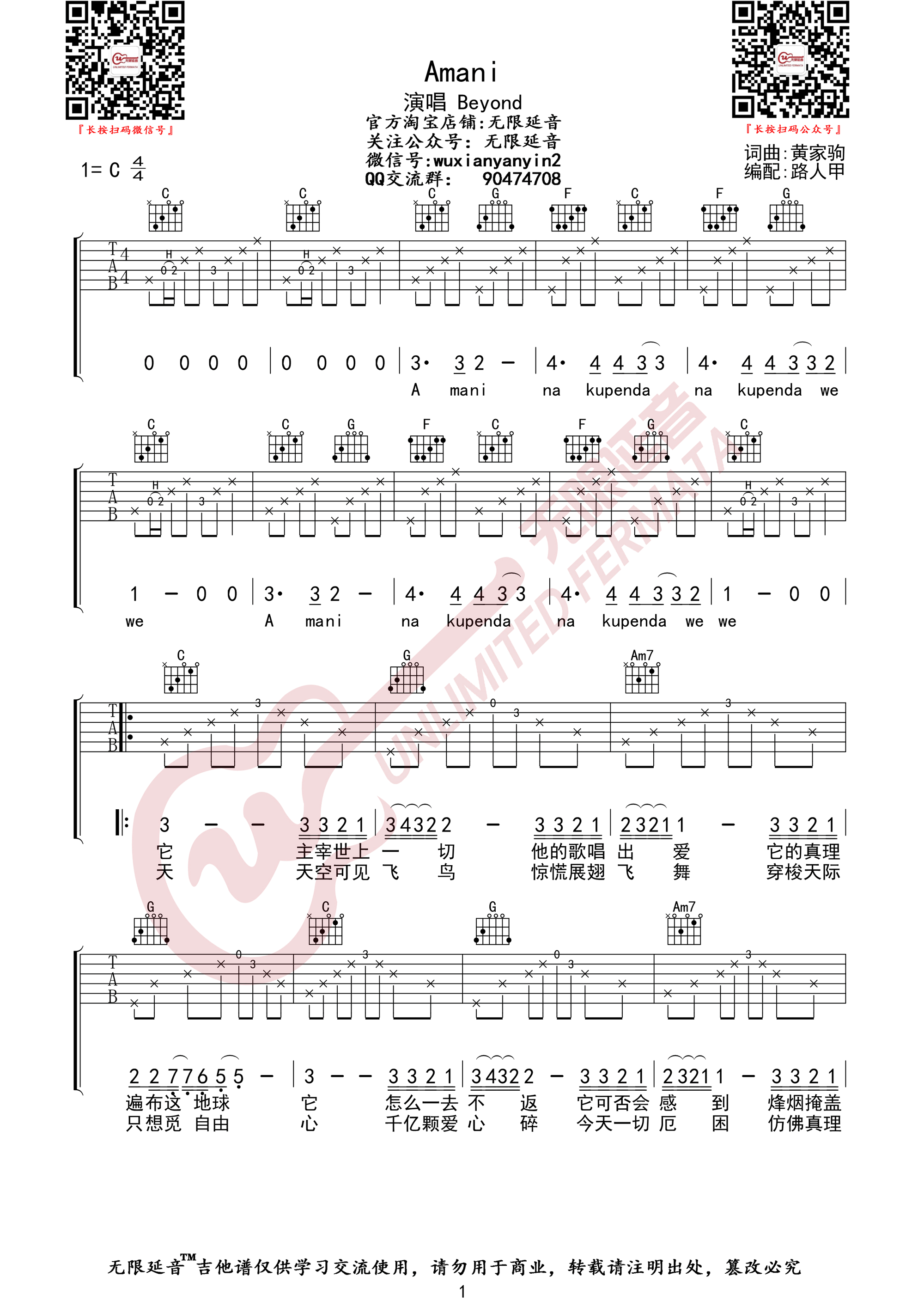 曲谱介绍: Beyond《Amani》吉他弹唱谱,采用C调指法编配,共有3张高清图谱。