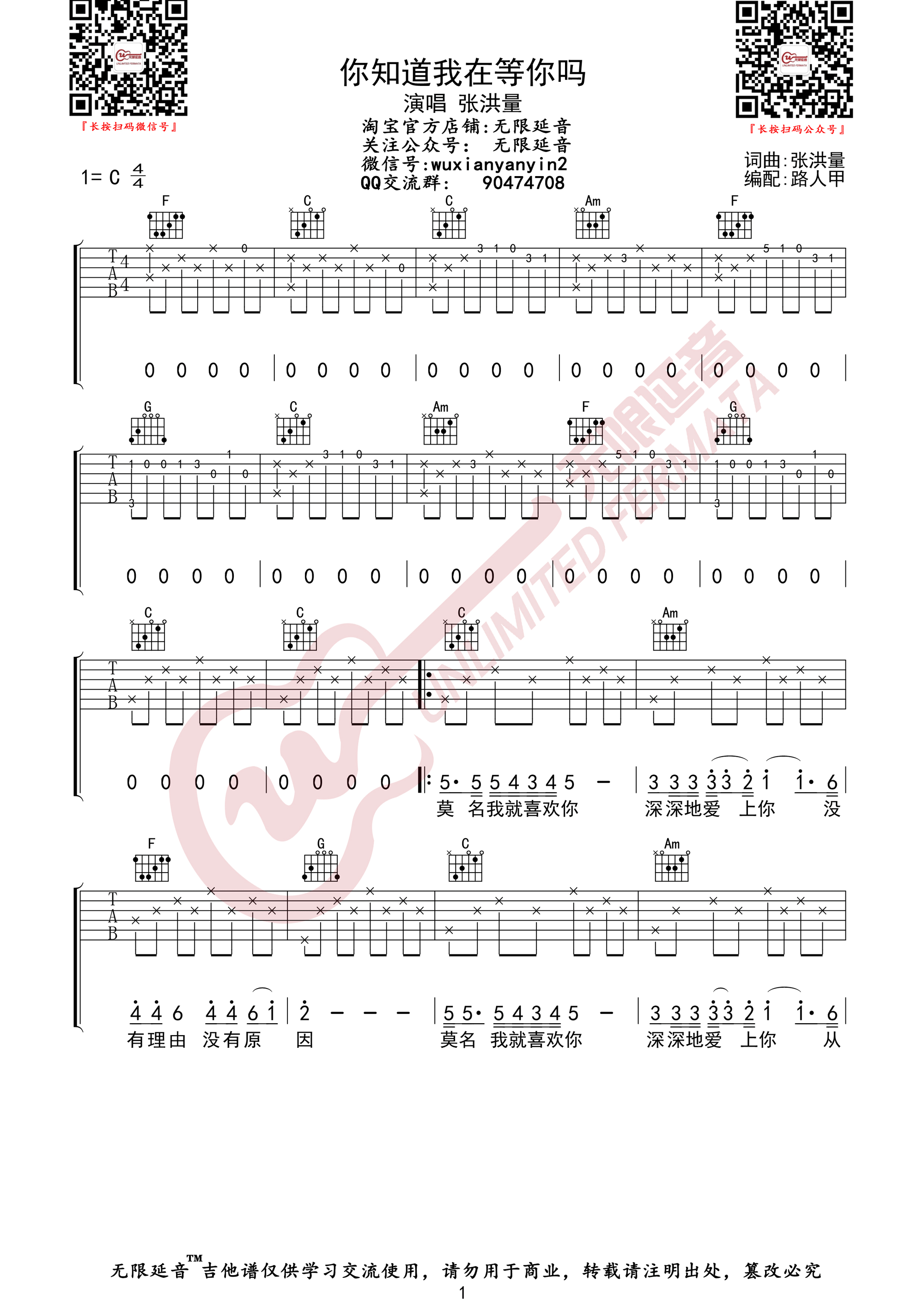 曲谱介绍: 张洪量《你知道我在等你吗》吉他弹唱谱,采用C调指法编配原版,共有2张高清图谱,免翻页排版设计。