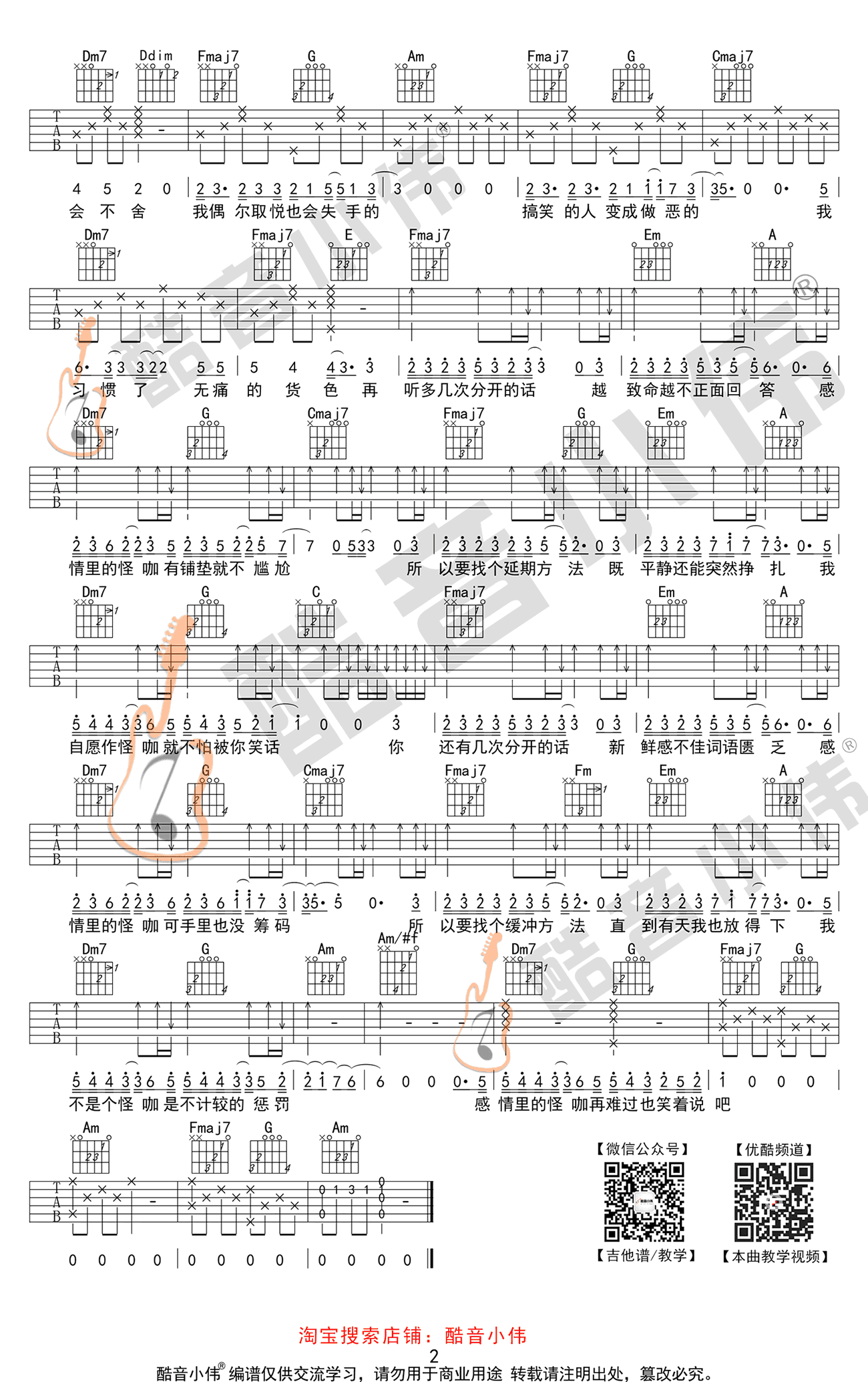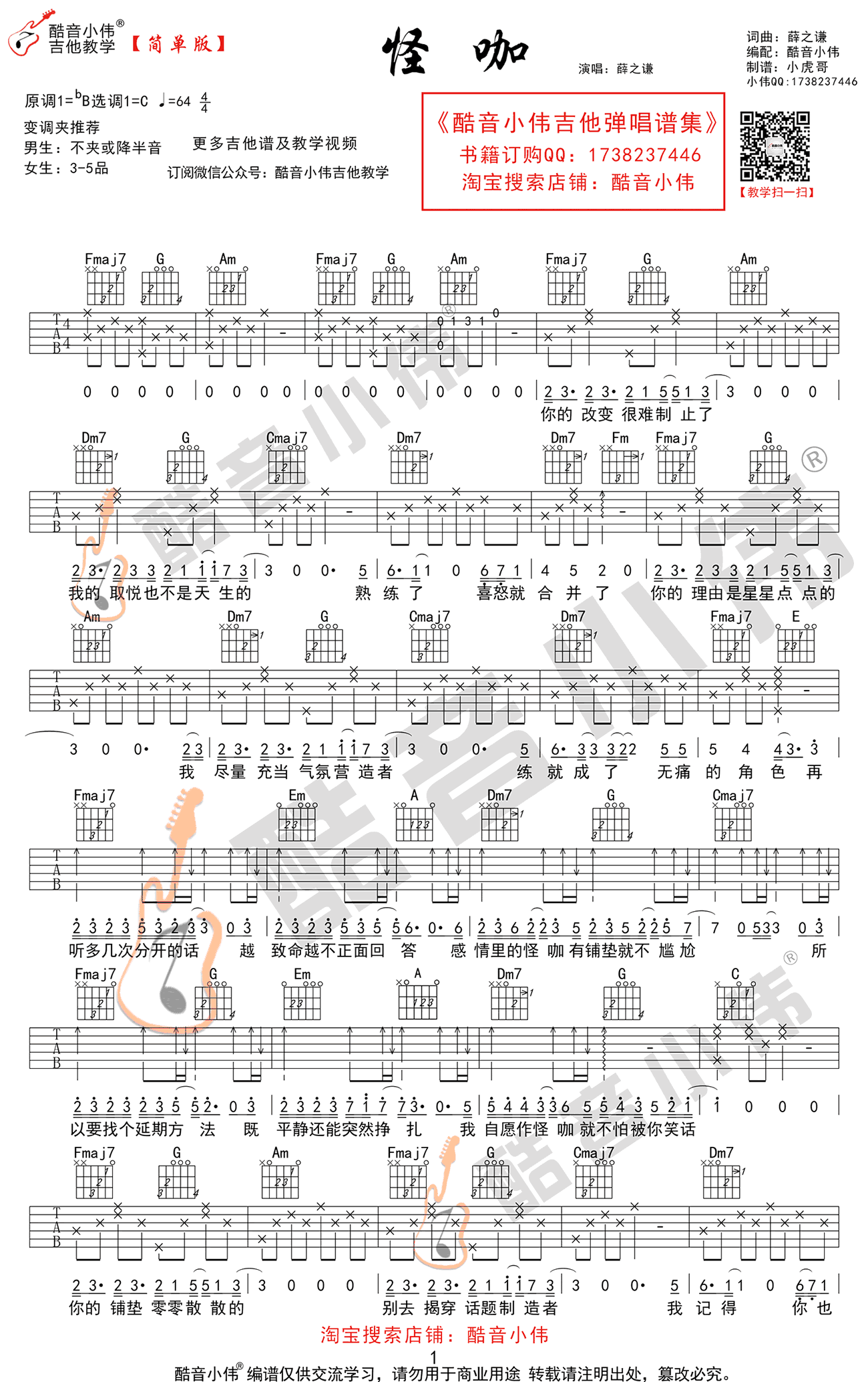 曲谱介绍: 薛之谦《怪咖》吉他弹唱谱,采用C调指法编配,共有2张高清图谱,免翻页排版设计。