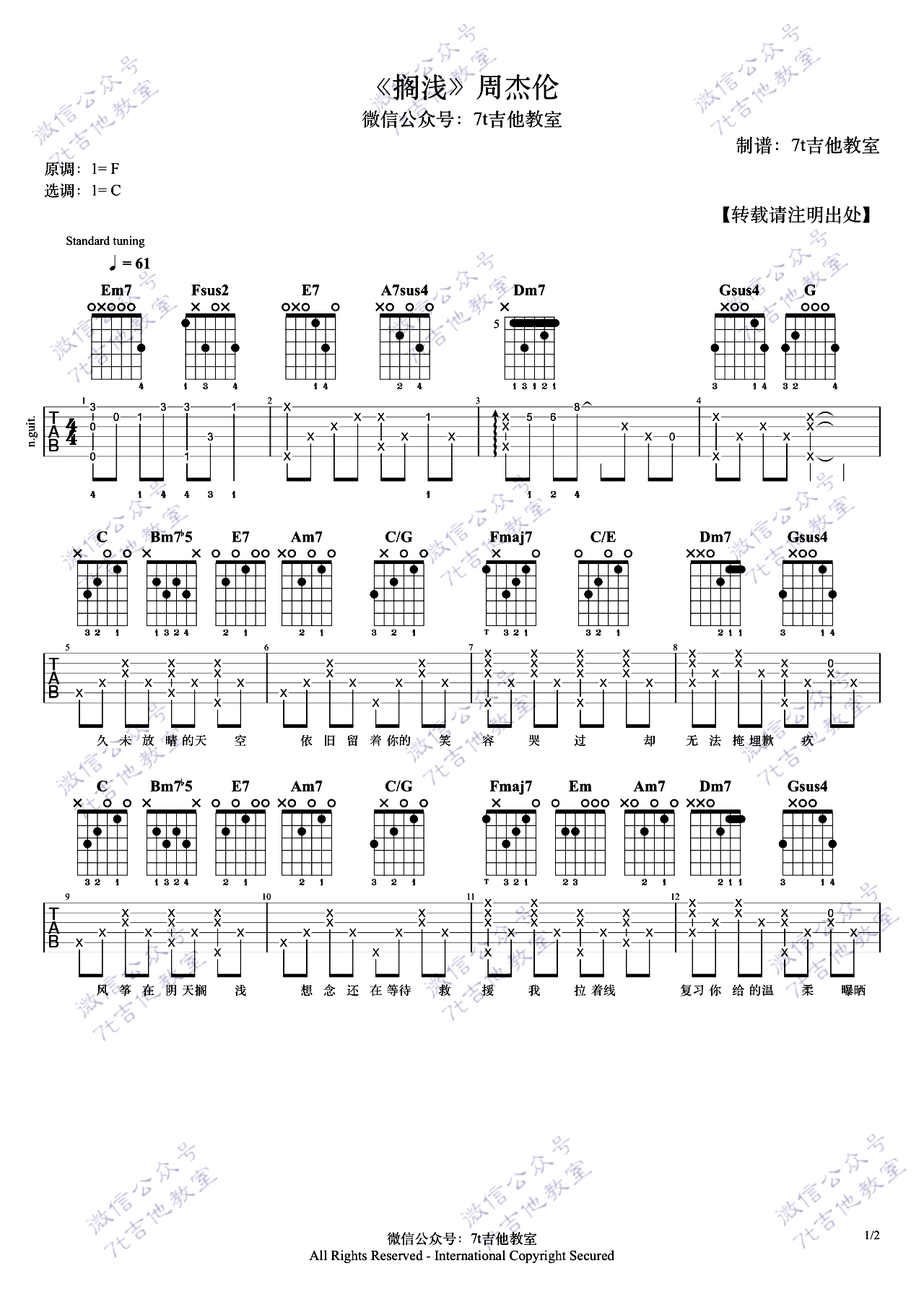 曲谱介绍: 周杰伦《搁浅》吉他弹唱谱,采用C调指法编配原版,共有2张高清图谱,免翻页排版设计。