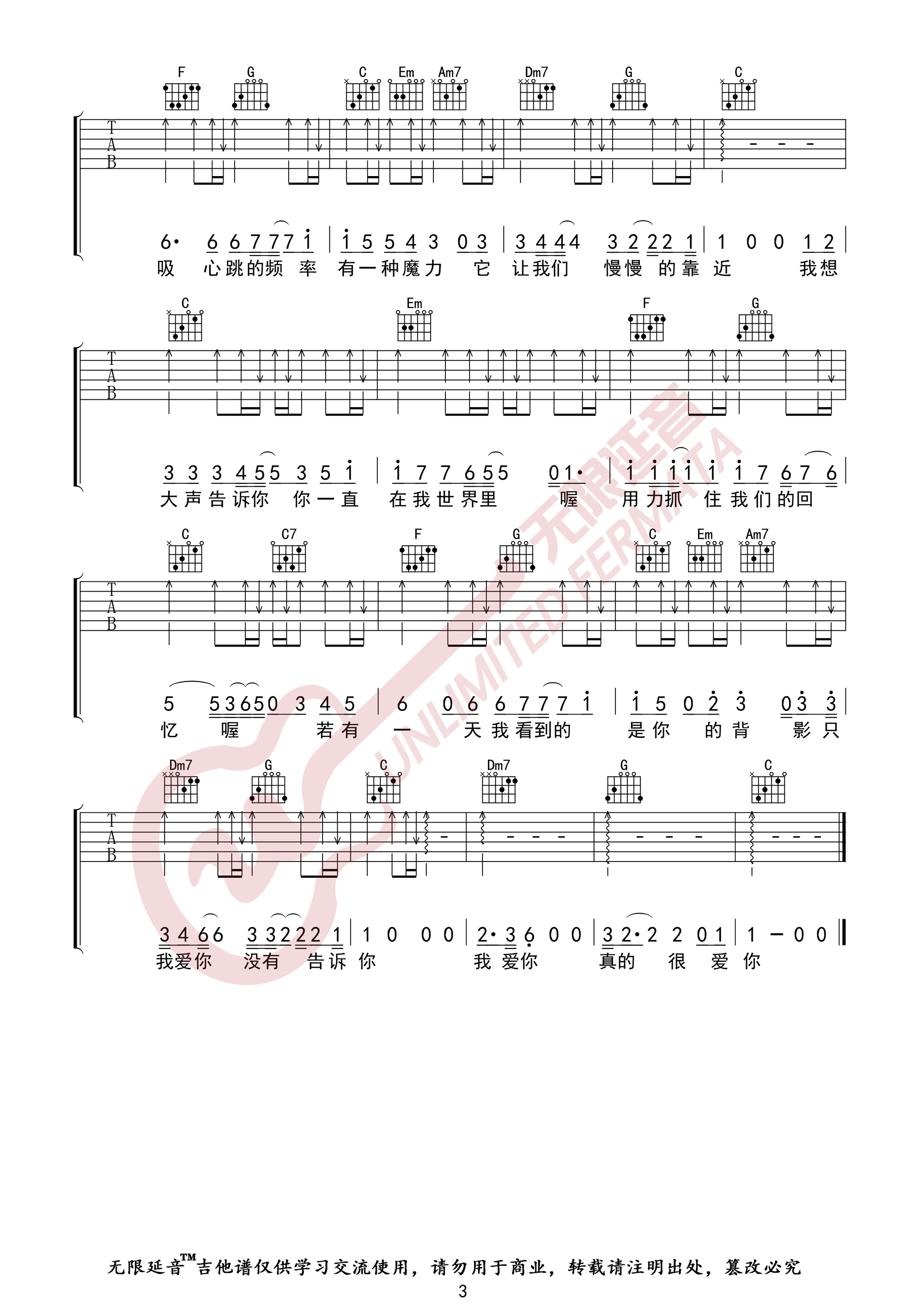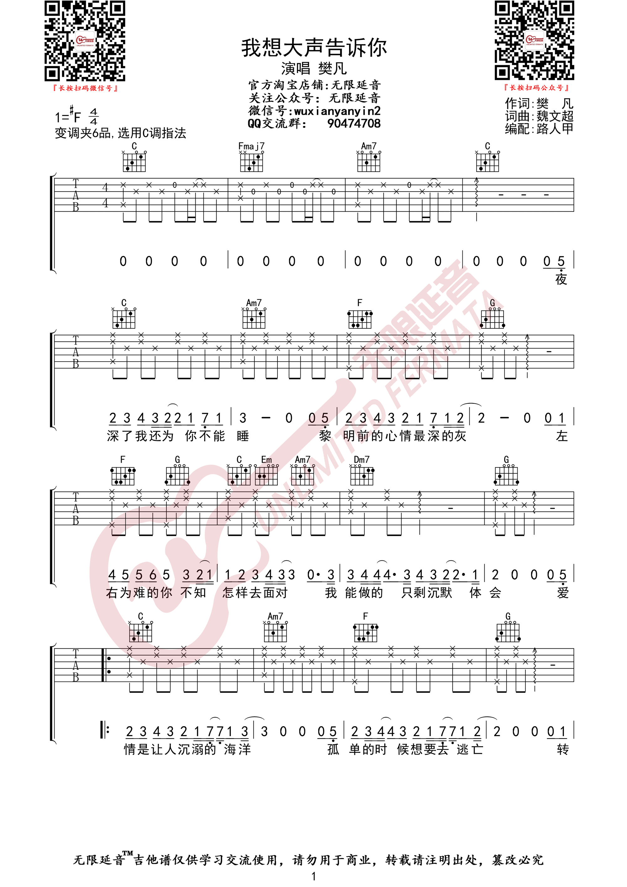 曲谱介绍: 樊凡《我想大声告诉你》吉他弹唱谱,采用C调指法编配原版,共有3张高清图谱。
