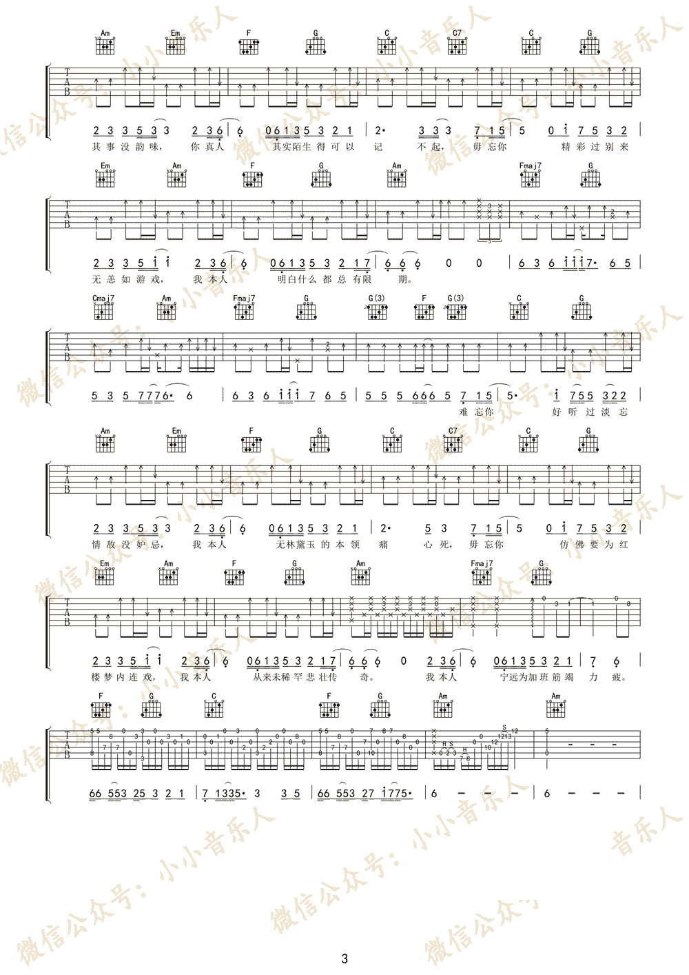 曲谱介绍: 吴雨霏/张敬轩《我本人》吉他弹唱谱,采用C调指法编配原版,共有3张高清图谱。