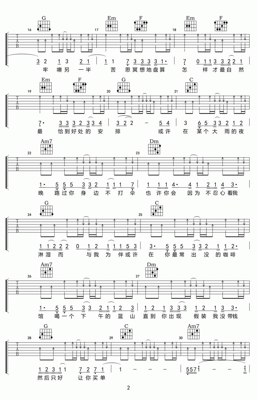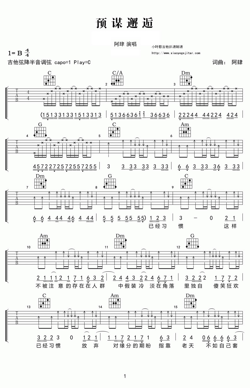 曲谱介绍: 阿肆《预谋邂逅》吉他弹唱谱,采用C调指法编配原版,共有2张高清图谱,免翻页排版设计。