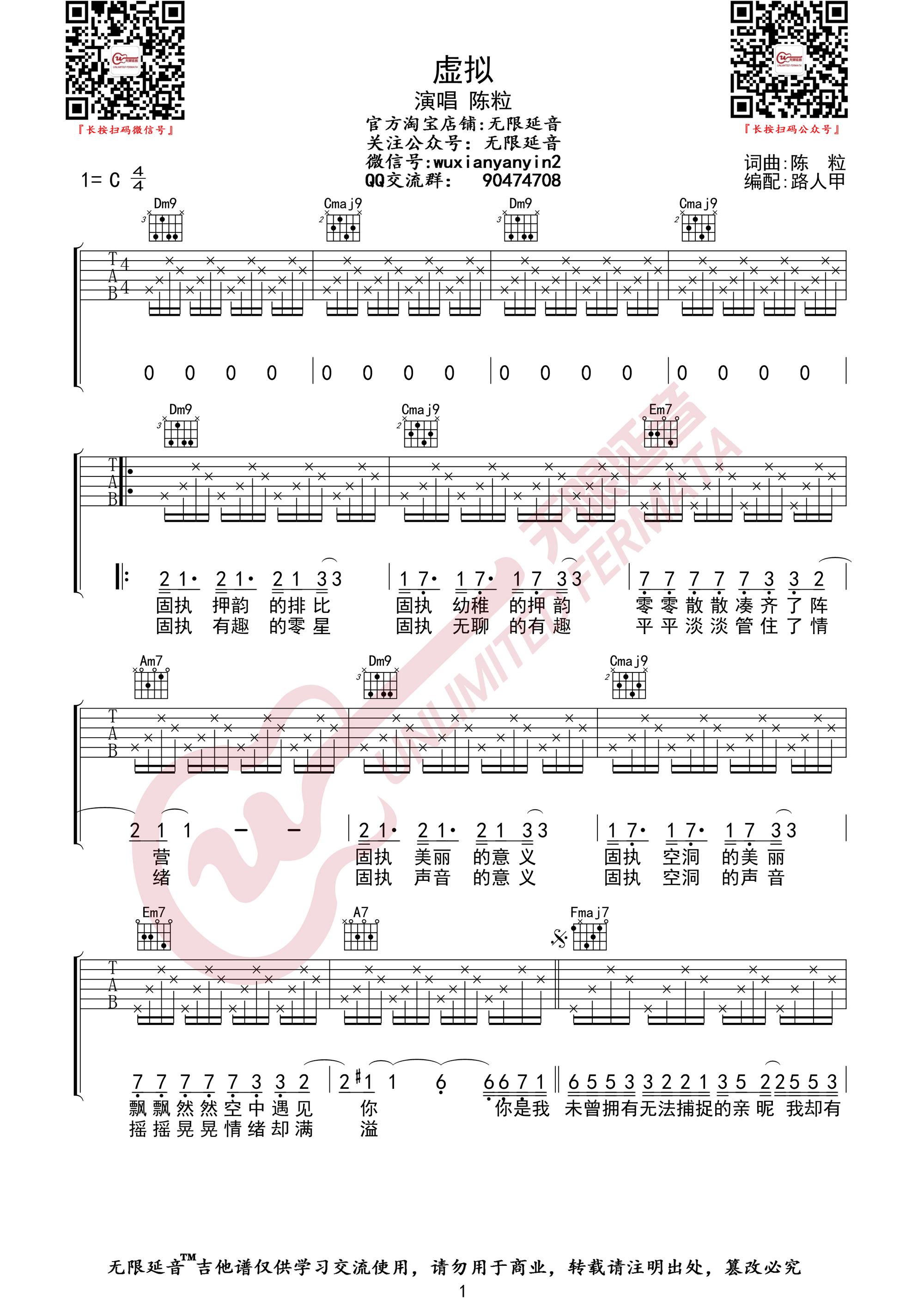 曲谱介绍: 陈粒《虚拟》吉他弹唱谱,采用C调指法编配原版,共有2张高清图谱,免翻页排版设计。