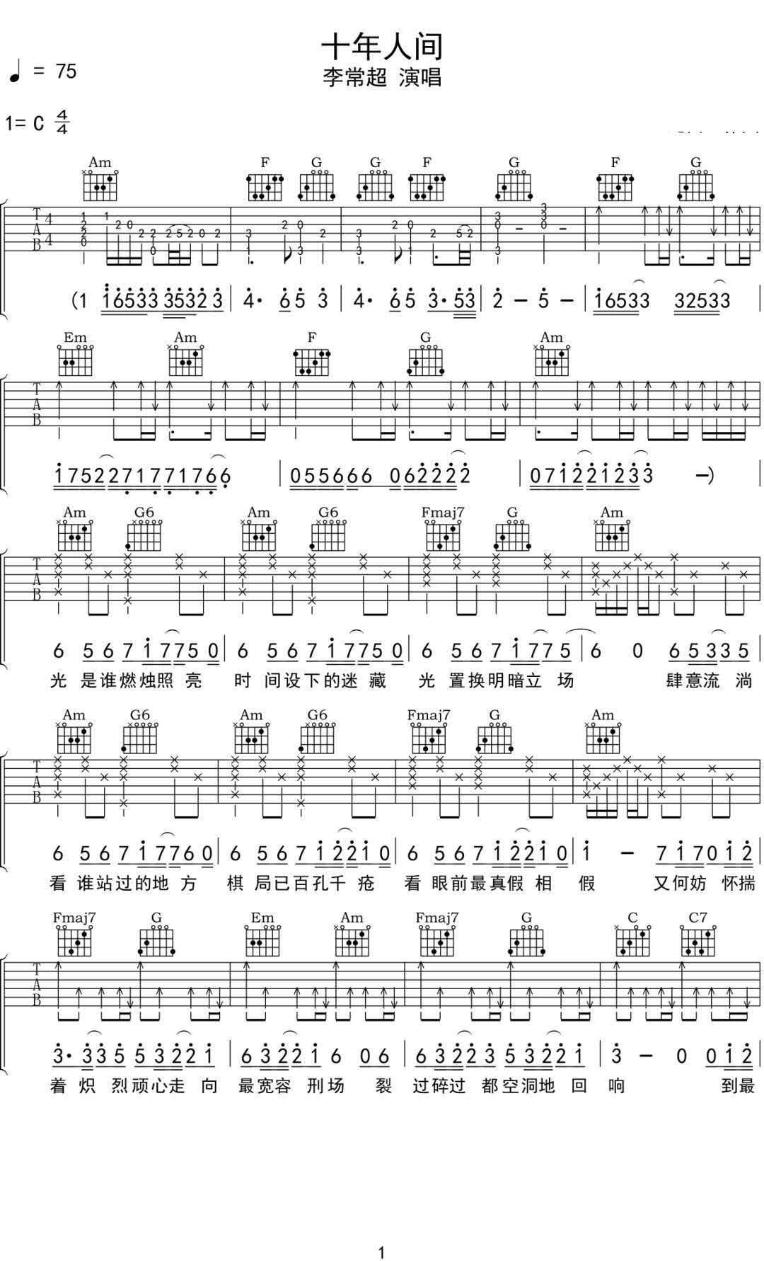曲谱介绍: 李常超《十年人间》吉他弹唱谱,采用C调指法编配原版,共有4张高清图谱。