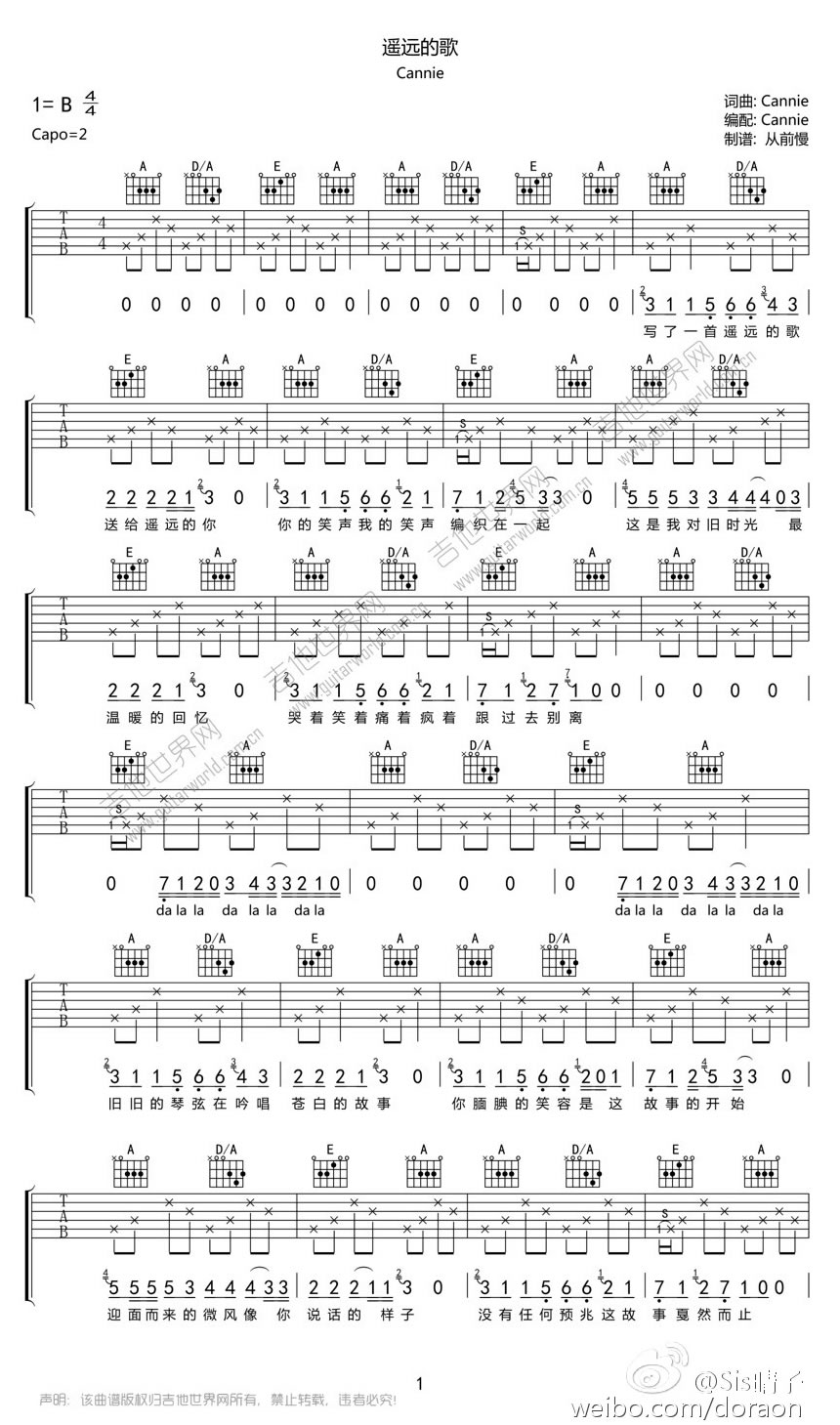 曲谱介绍: Cannie《遥远的歌》吉他弹唱谱,采用A调指法编配原版,共有2张高清图谱,免翻页排版设计。