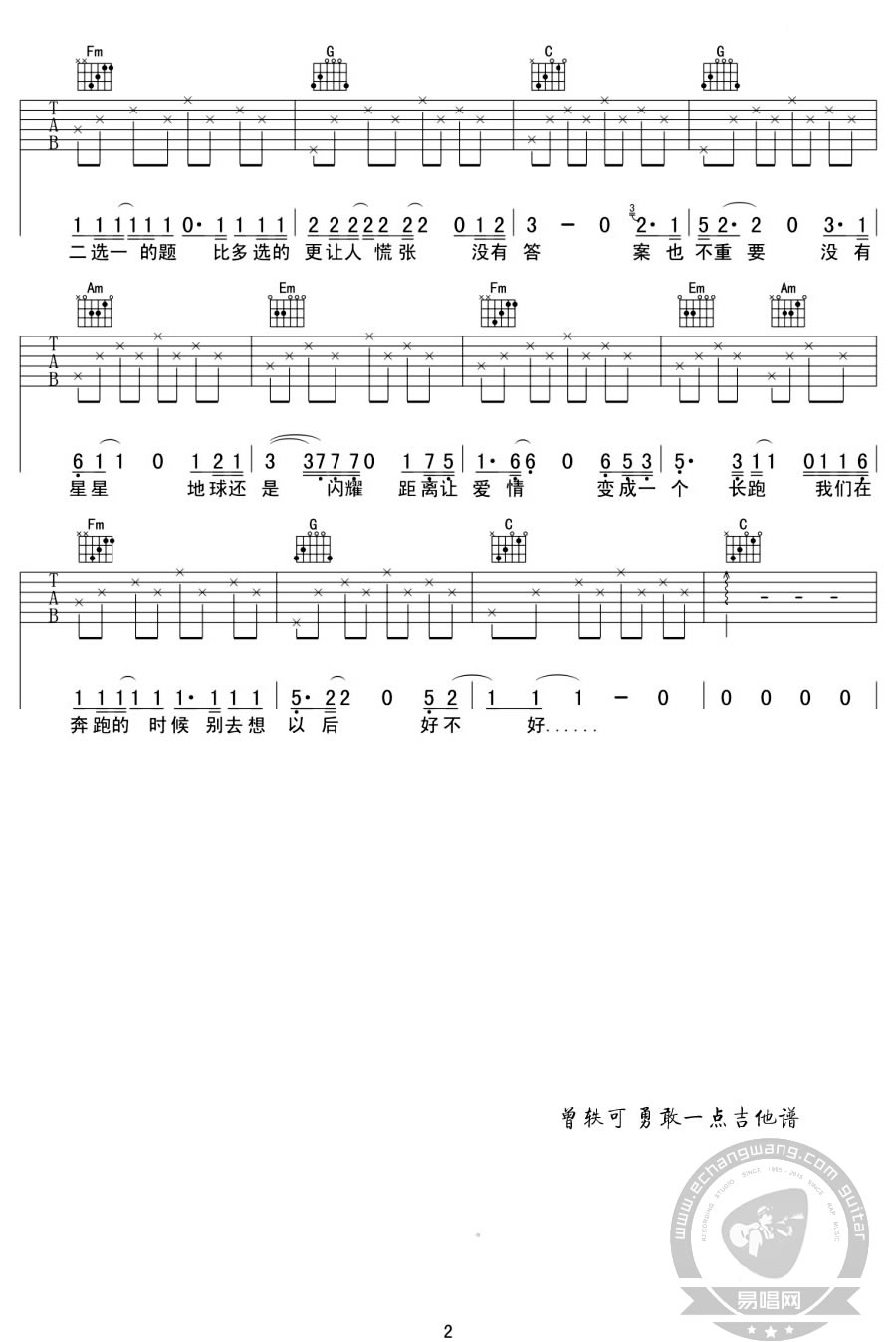 曲谱介绍: 曾轶可《勇敢一点》吉他弹唱谱,采用C调指法编配,共有2张高清图谱,免翻页排版设计。