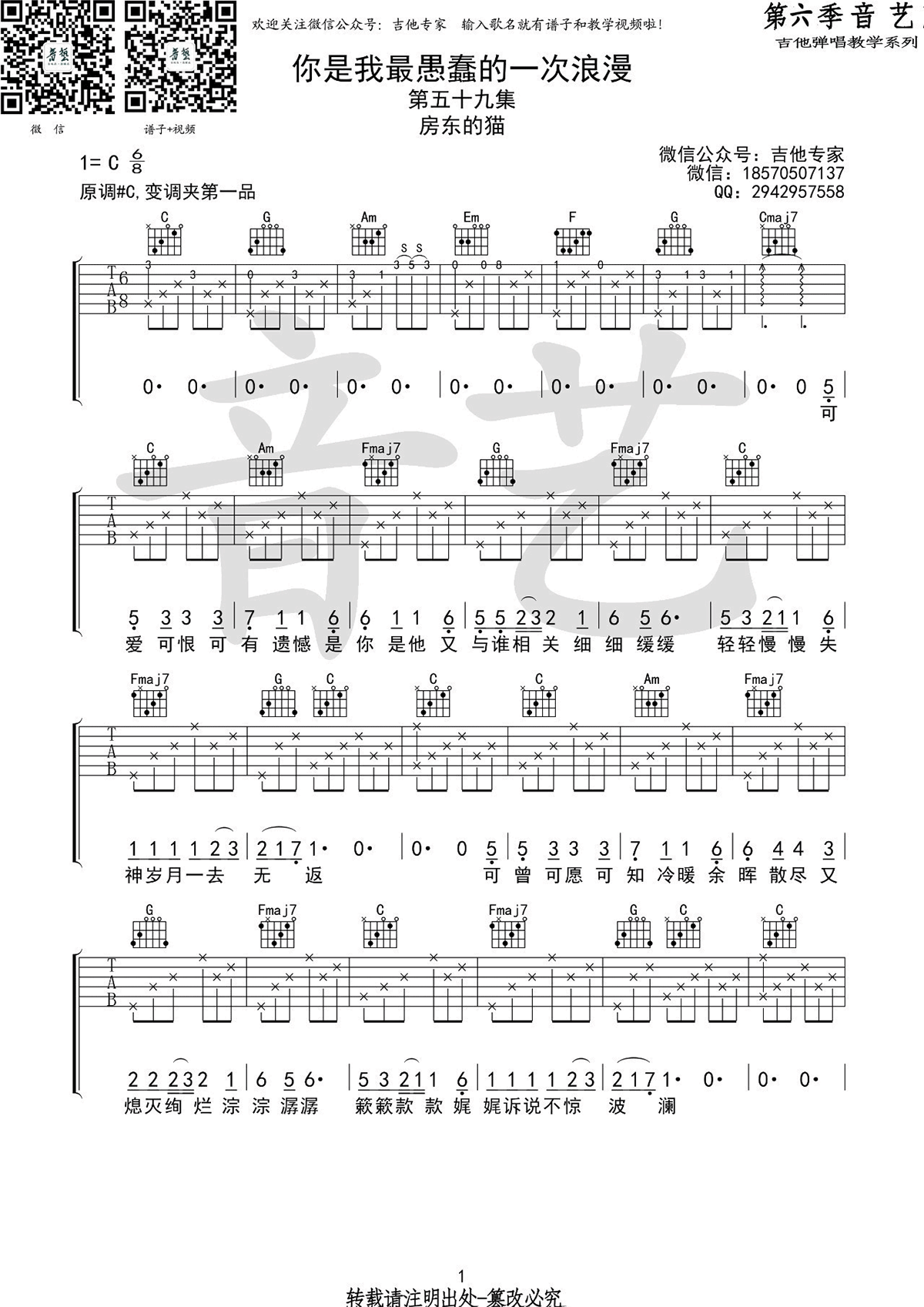 曲谱介绍: 房东的猫《你是我最愚蠢的一次浪漫》吉他弹唱谱,采用C调指法编配原版,共有3张高清图谱。
