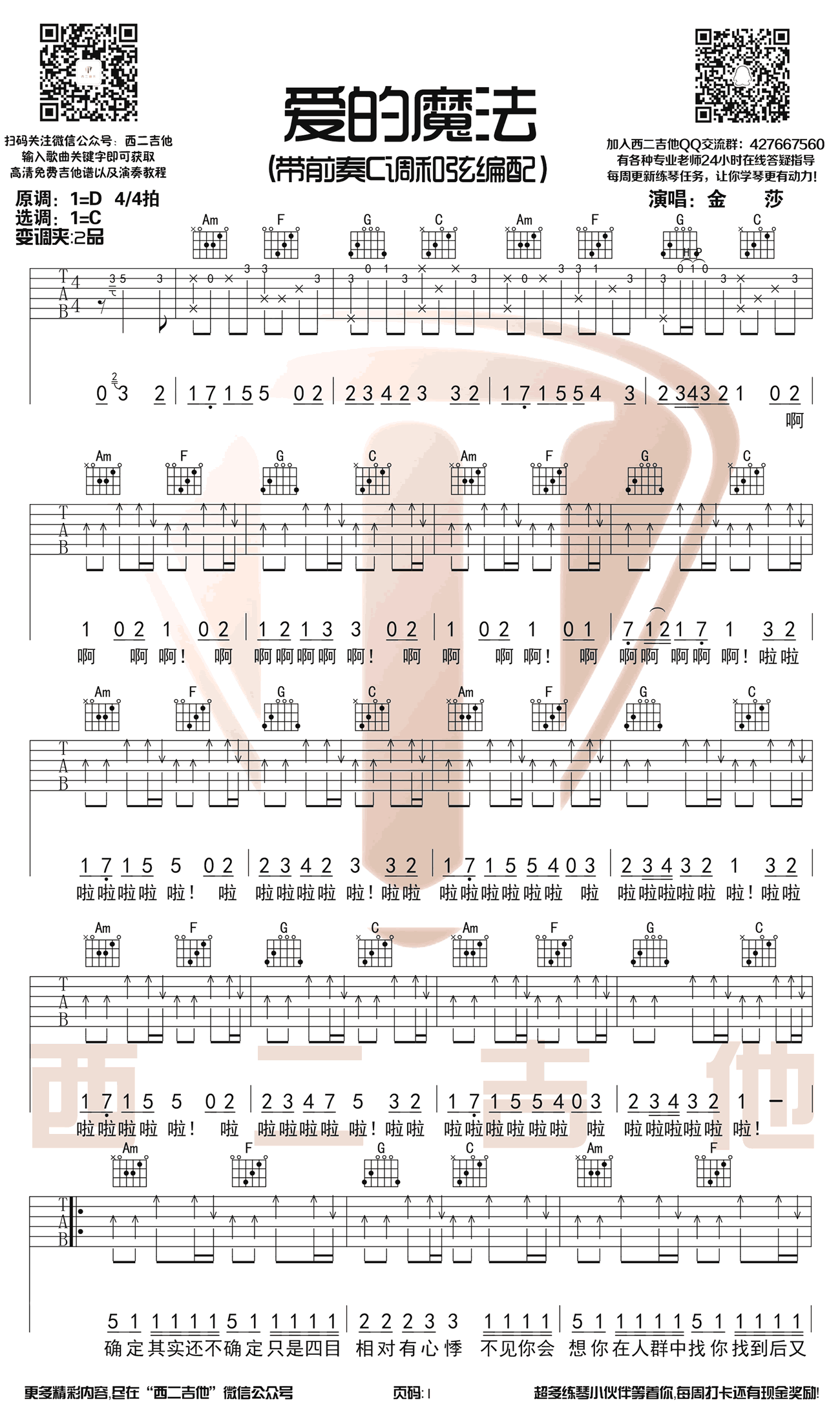曲谱介绍: 金莎《爱的魔法》吉他弹唱谱,采用C调指法编配原版,共有2张高清图谱,免翻页排版设计。
