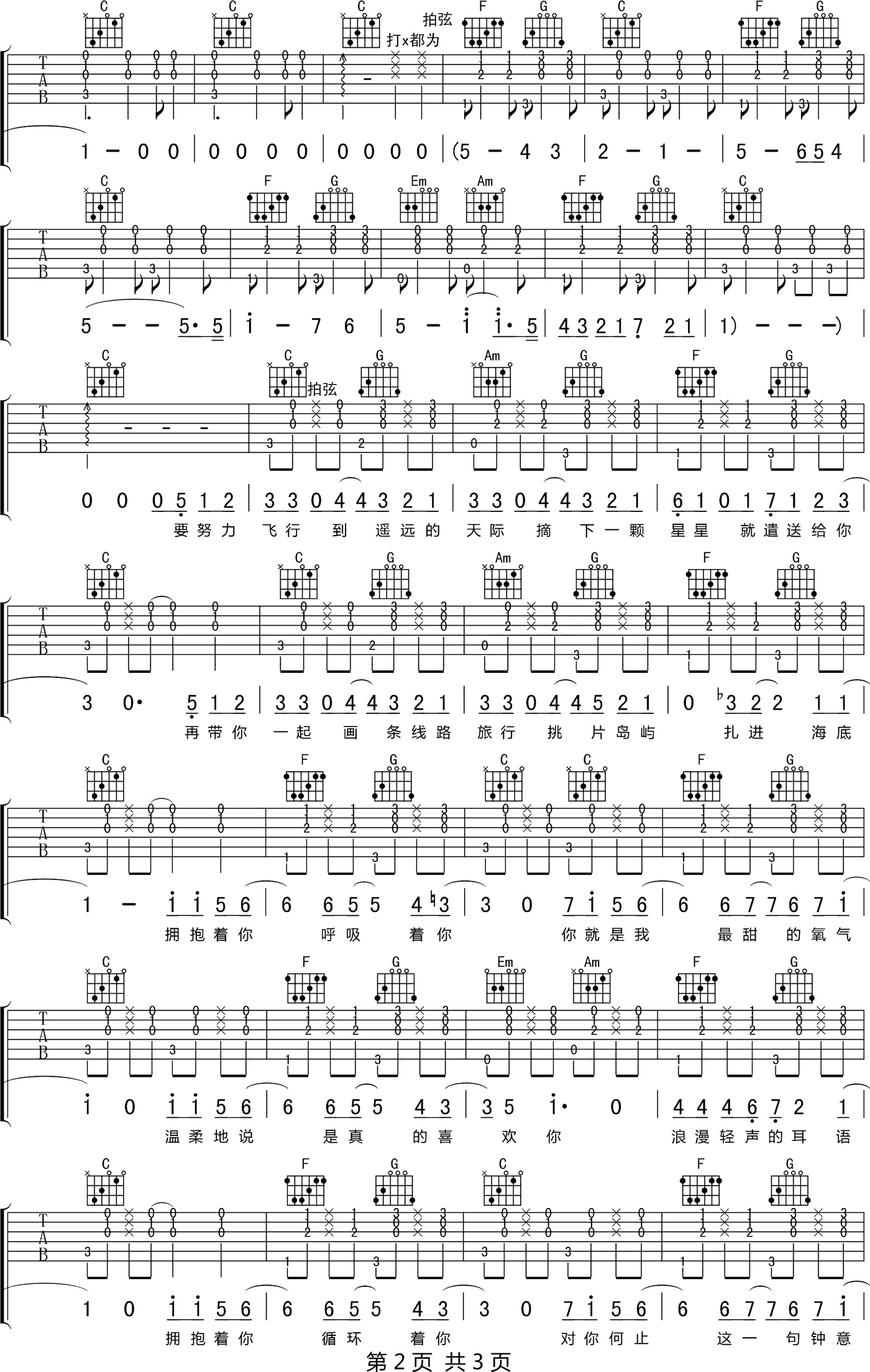 曲谱介绍: 徐秉龙《拥抱》吉他弹唱谱,采用C调指法编配原版,共有3张高清图谱。