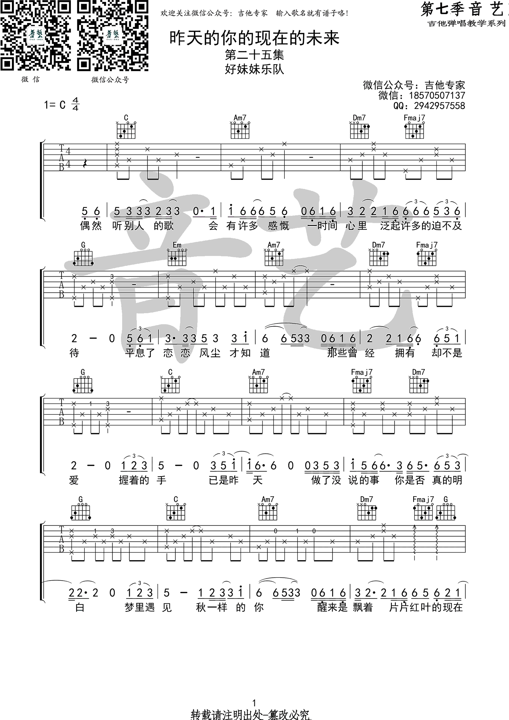 曲谱介绍: 好妹妹乐队《昨天的你的现在的未来》吉他弹唱谱,采用C调指法编配,共有4张高清图谱。