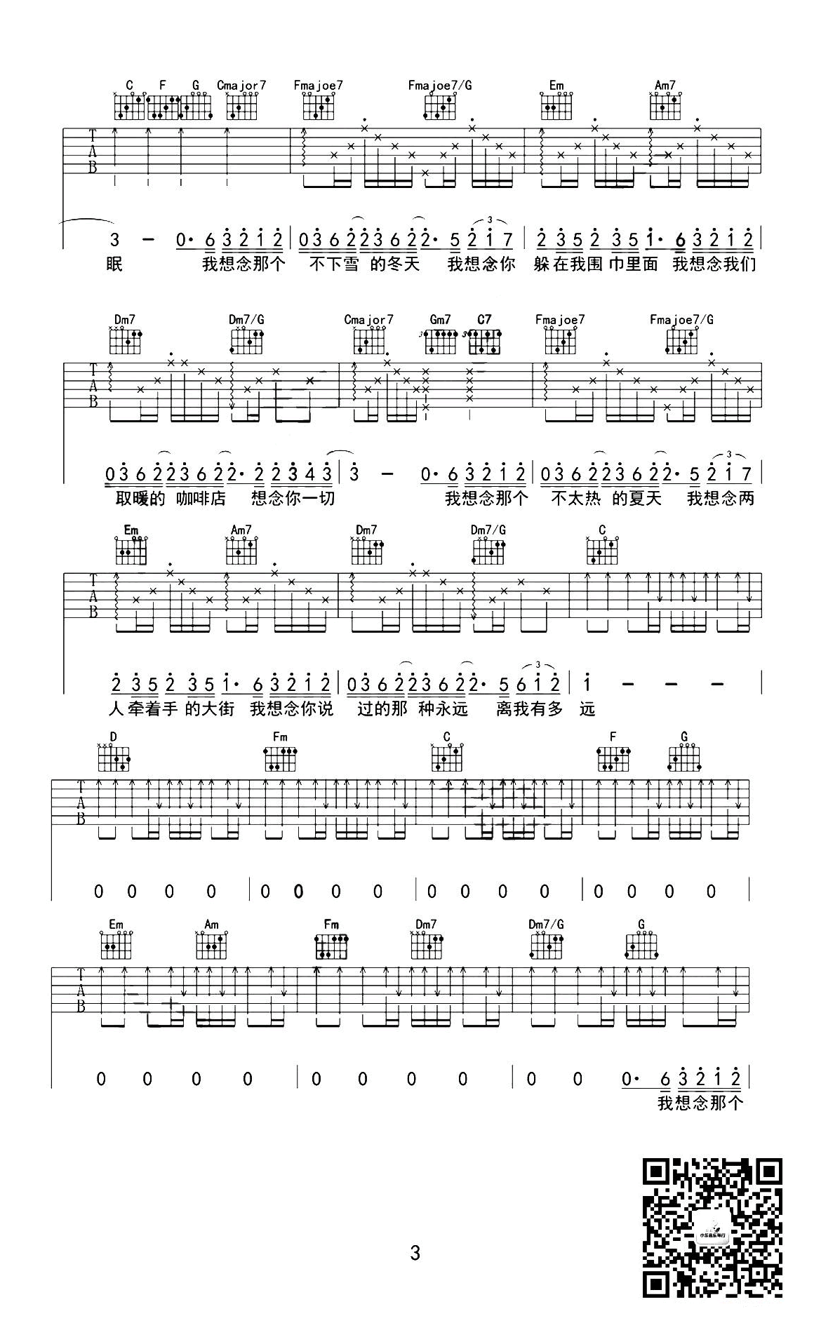 曲谱介绍: 金志文《我想念》吉他弹唱谱,采用G调指法编配原版,共有4张高清图谱。