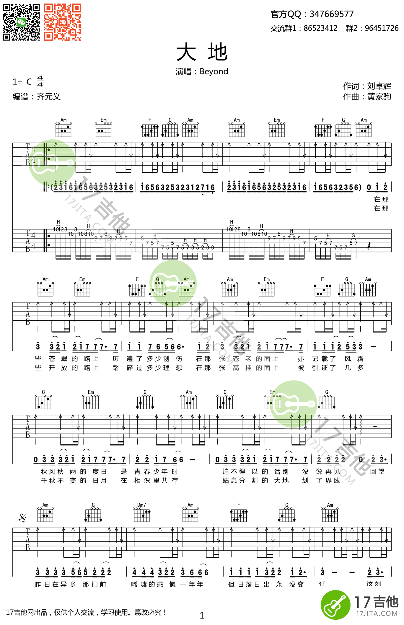 曲谱介绍: Beyond《大地》吉他弹唱谱,采用C调指法编配,共有2张高清图谱,免翻页排版设计。