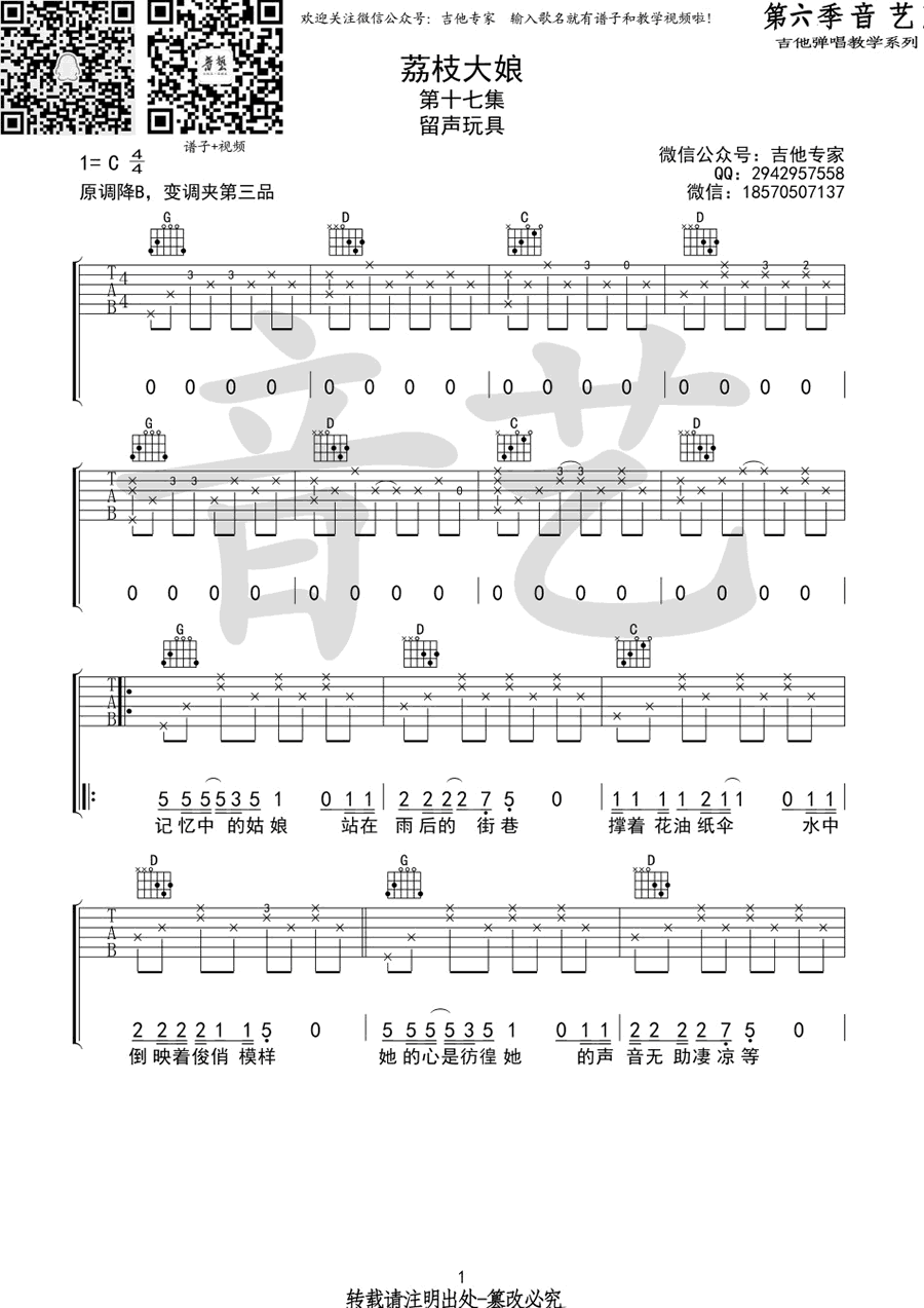 曲谱介绍: 留声玩具《荔枝大娘》吉他弹唱谱,采用C调指法编配,共有3张高清图谱。