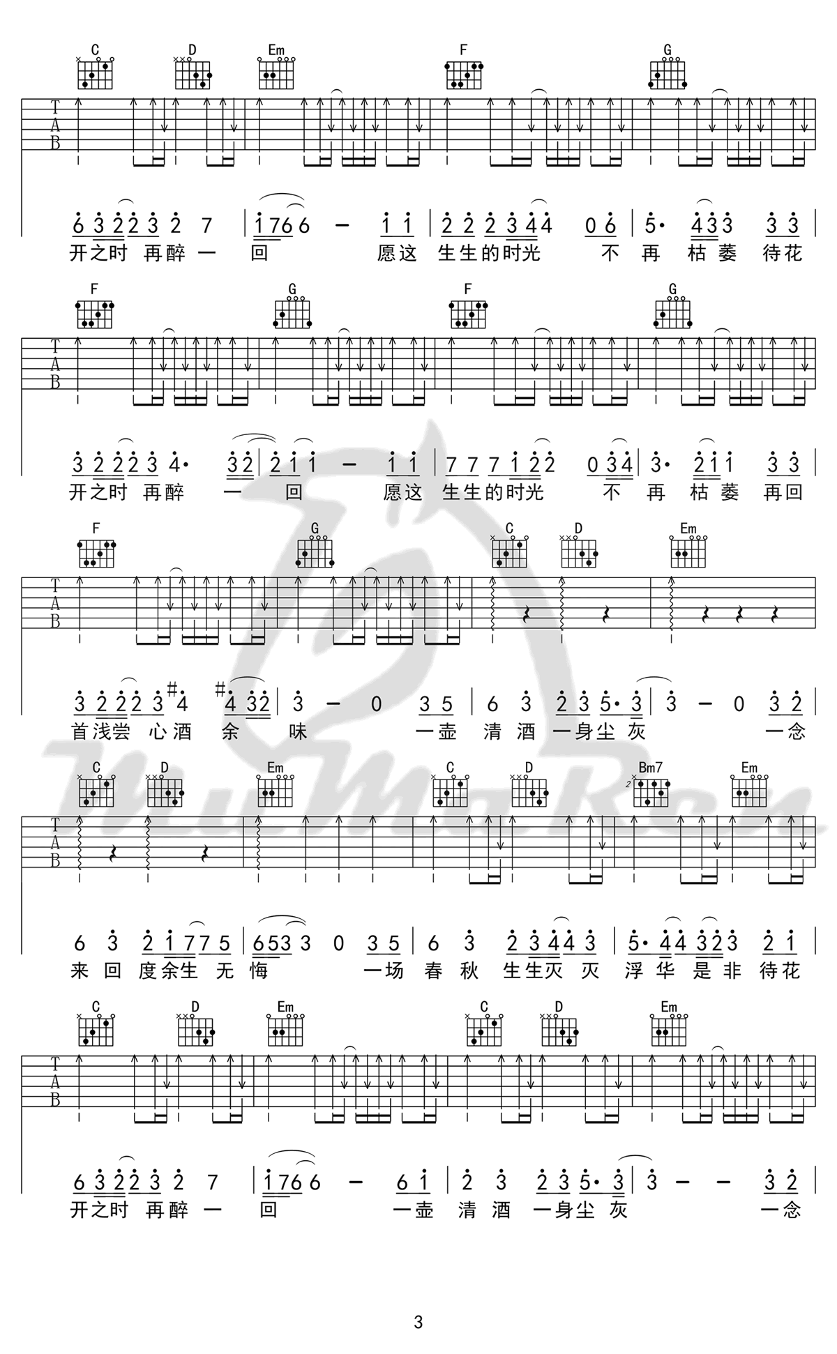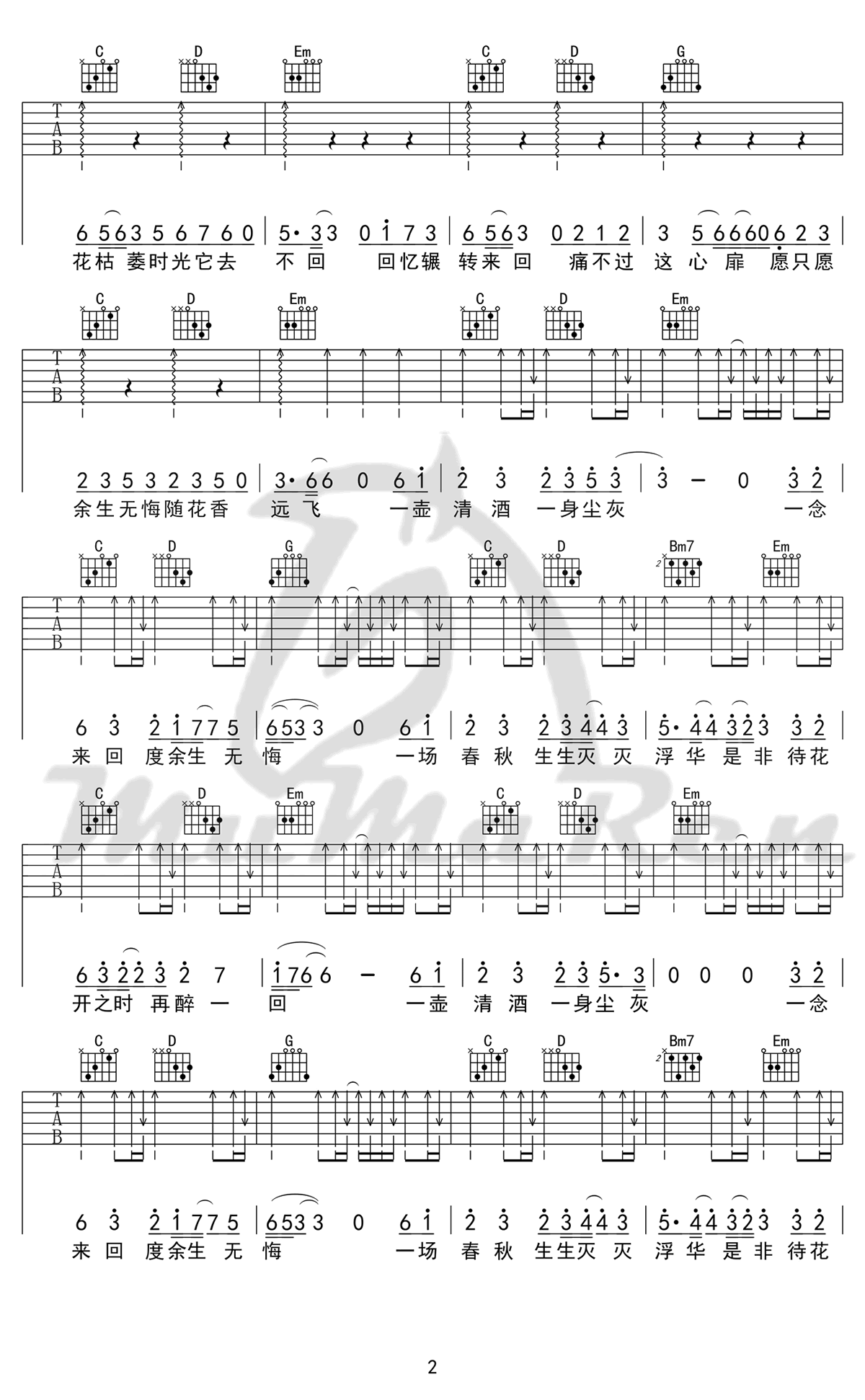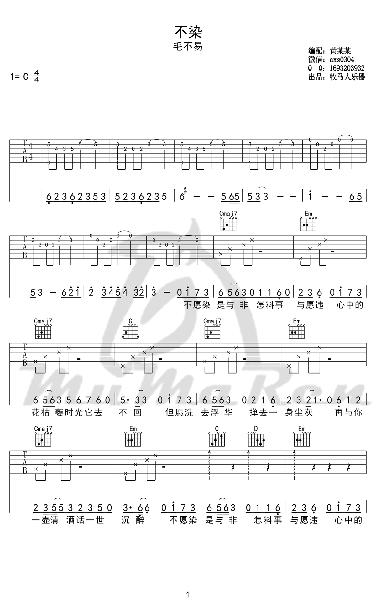 曲谱介绍: 毛不易《不染》吉他弹唱谱,采用C调指法编配原版,共有4张高清图谱。