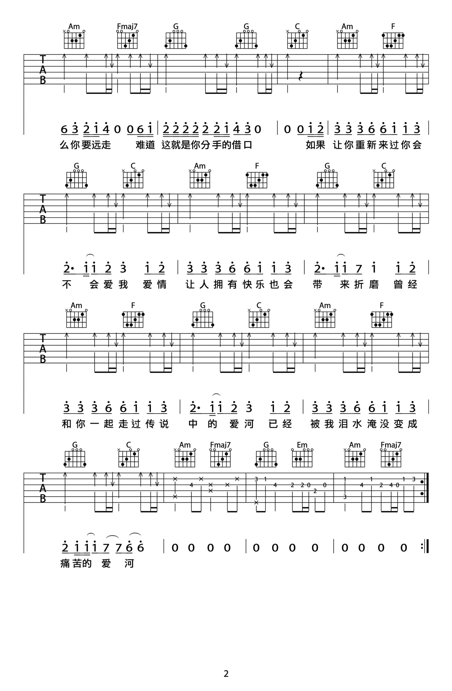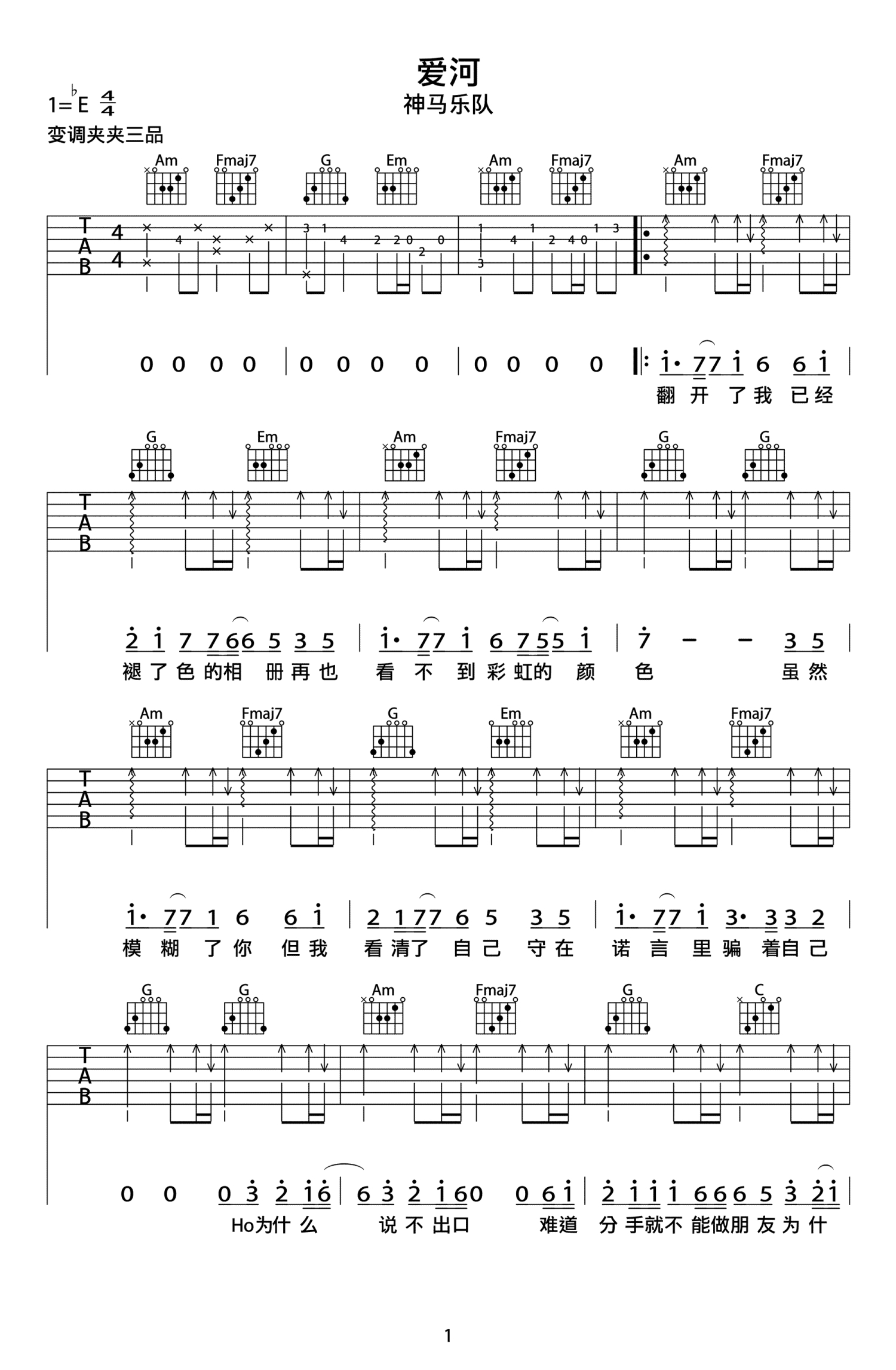 曲谱介绍: 神马乐团《爱河》吉他谱,歌曲原调降E调,变调夹夹三品,这首火爆网络的神曲是神马乐团组合的代表作品,许云上词曲,歌曲唱出爱情的伤痛和无奈。