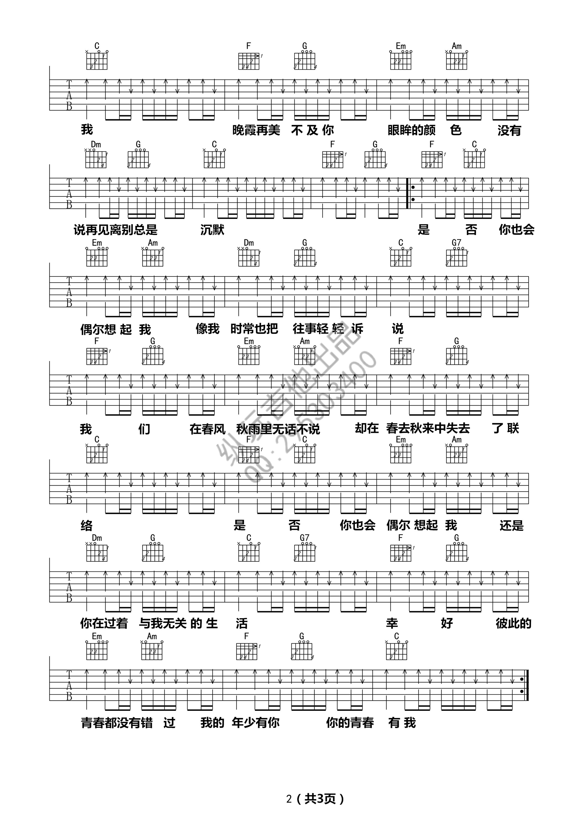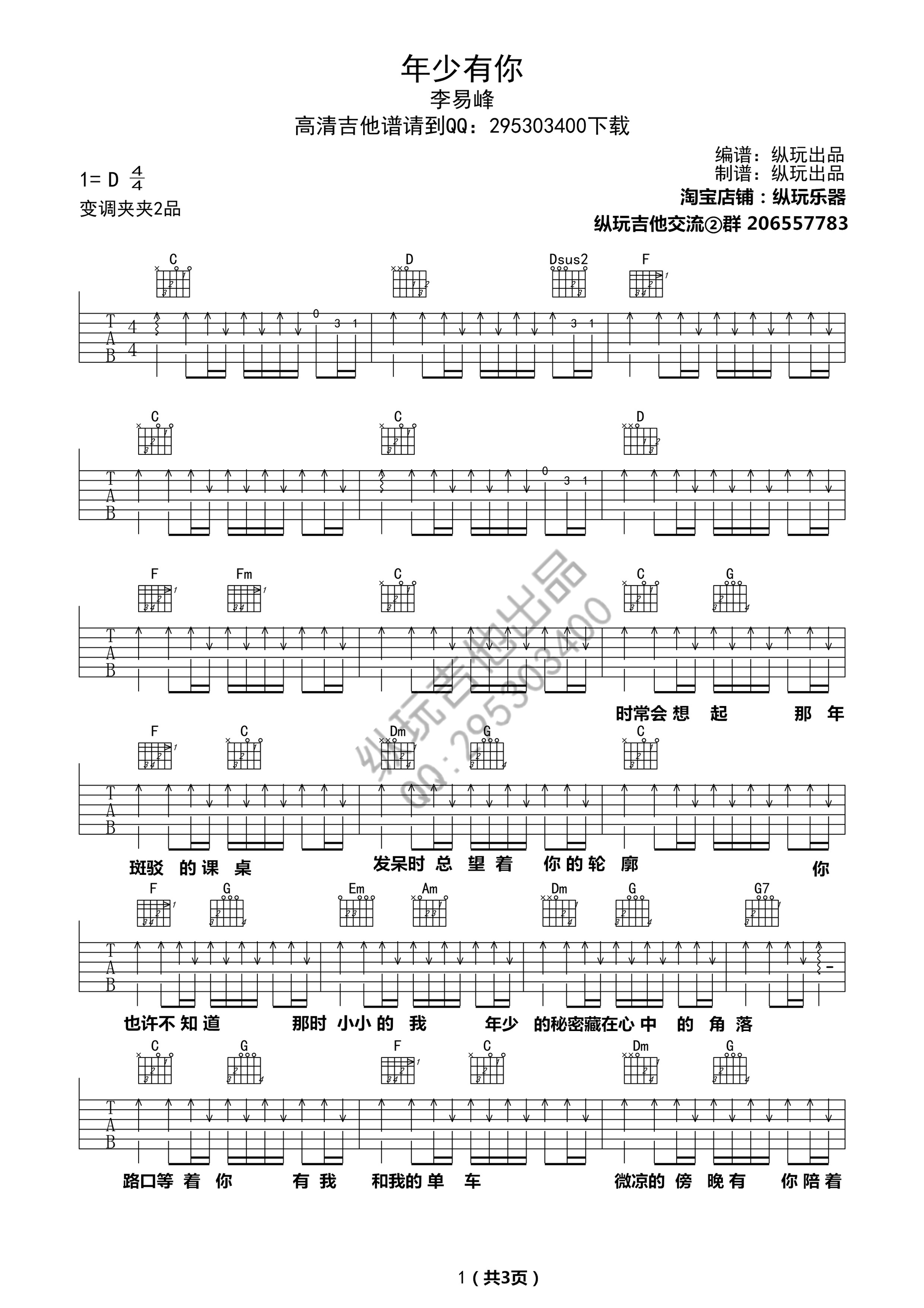 曲谱介绍: 李易峰《年少有你》吉他弹唱谱,采用D调指法编配原版,共有3张高清图谱。