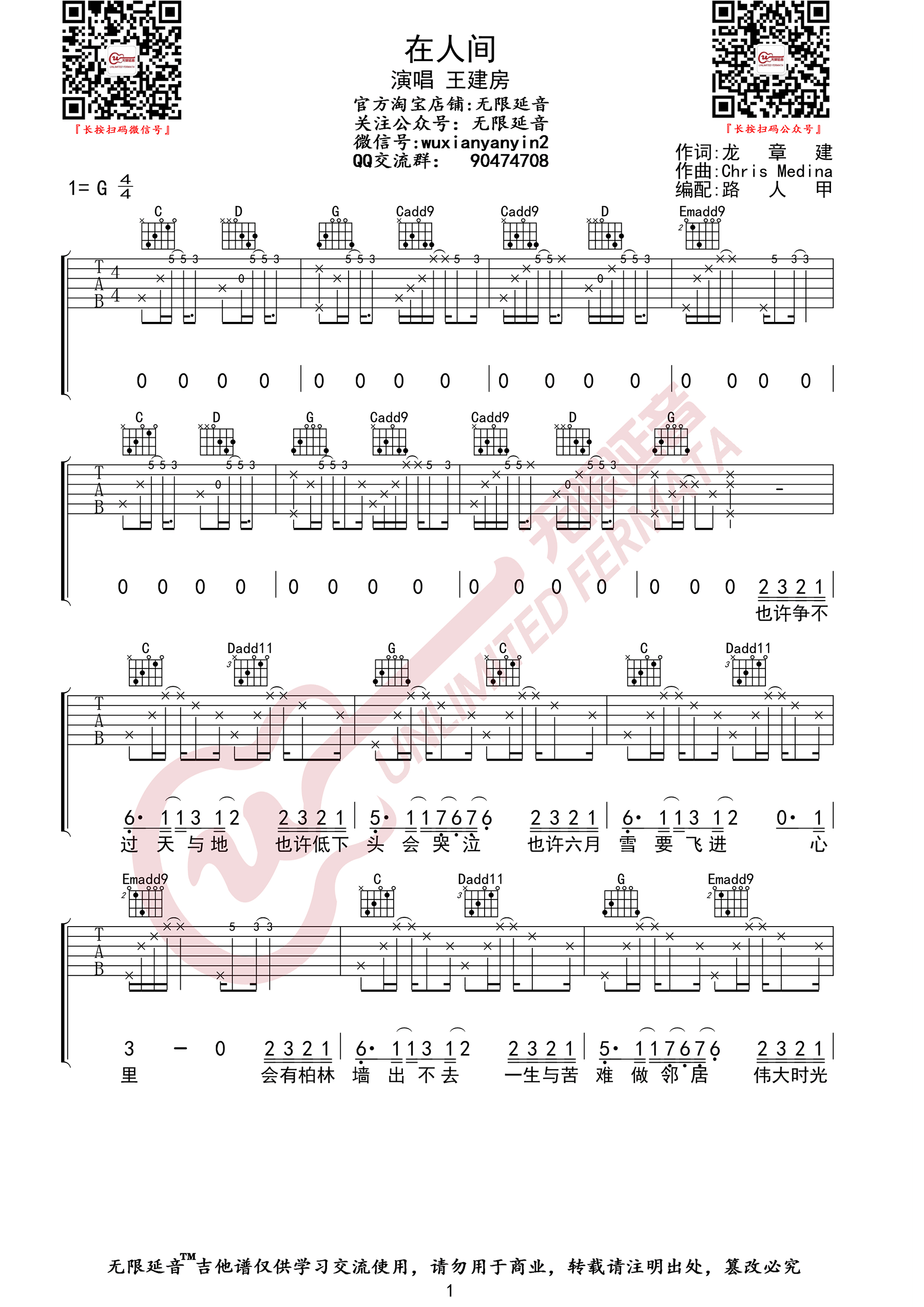 曲谱介绍: 王建房《在人间》吉他弹唱谱,采用G调指法编配原版,共有3张高清图谱。