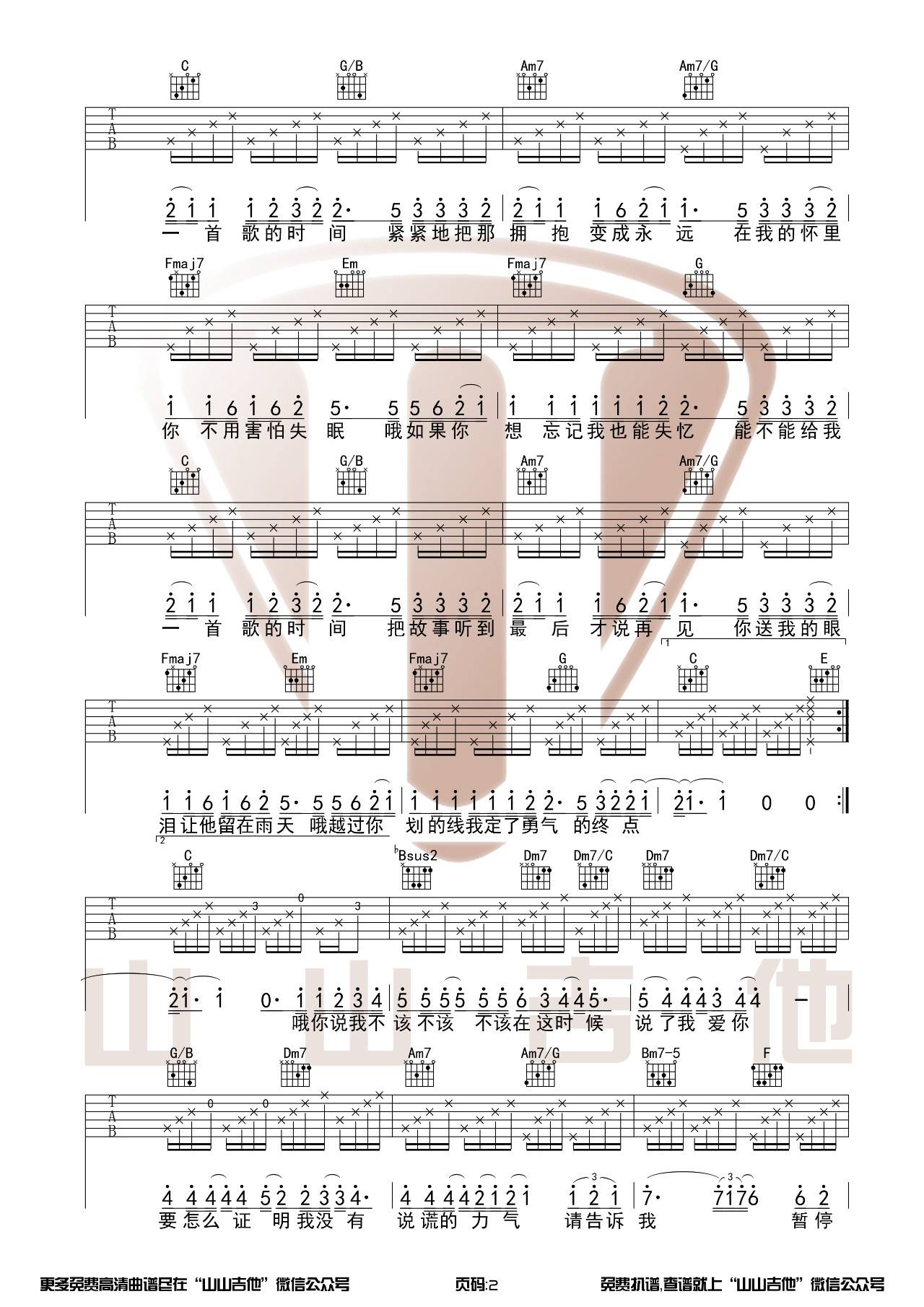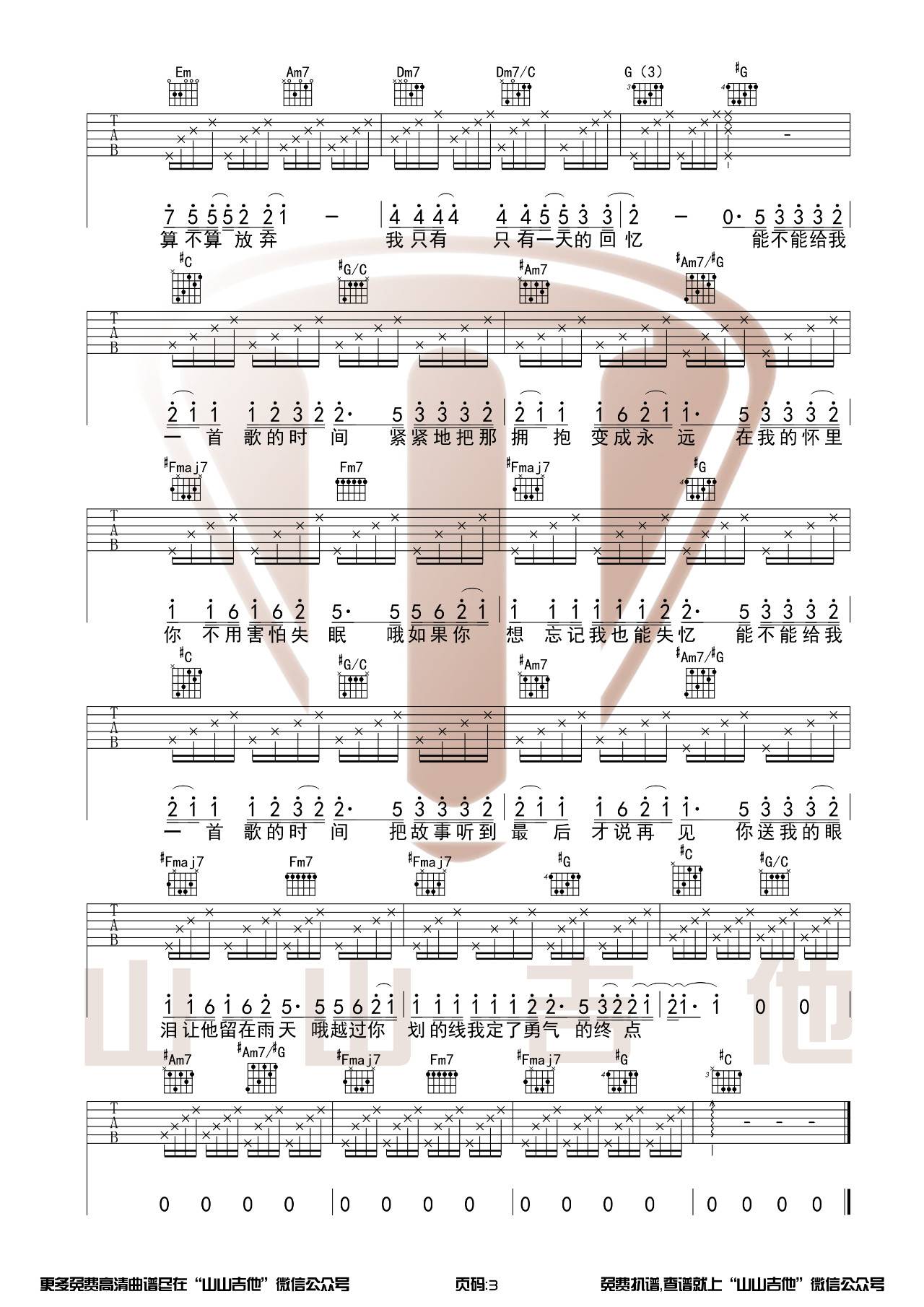 曲谱介绍: 周杰伦《给我一首歌的时间》吉他弹唱谱,采用C调指法编配原版,共有3张高清图谱。