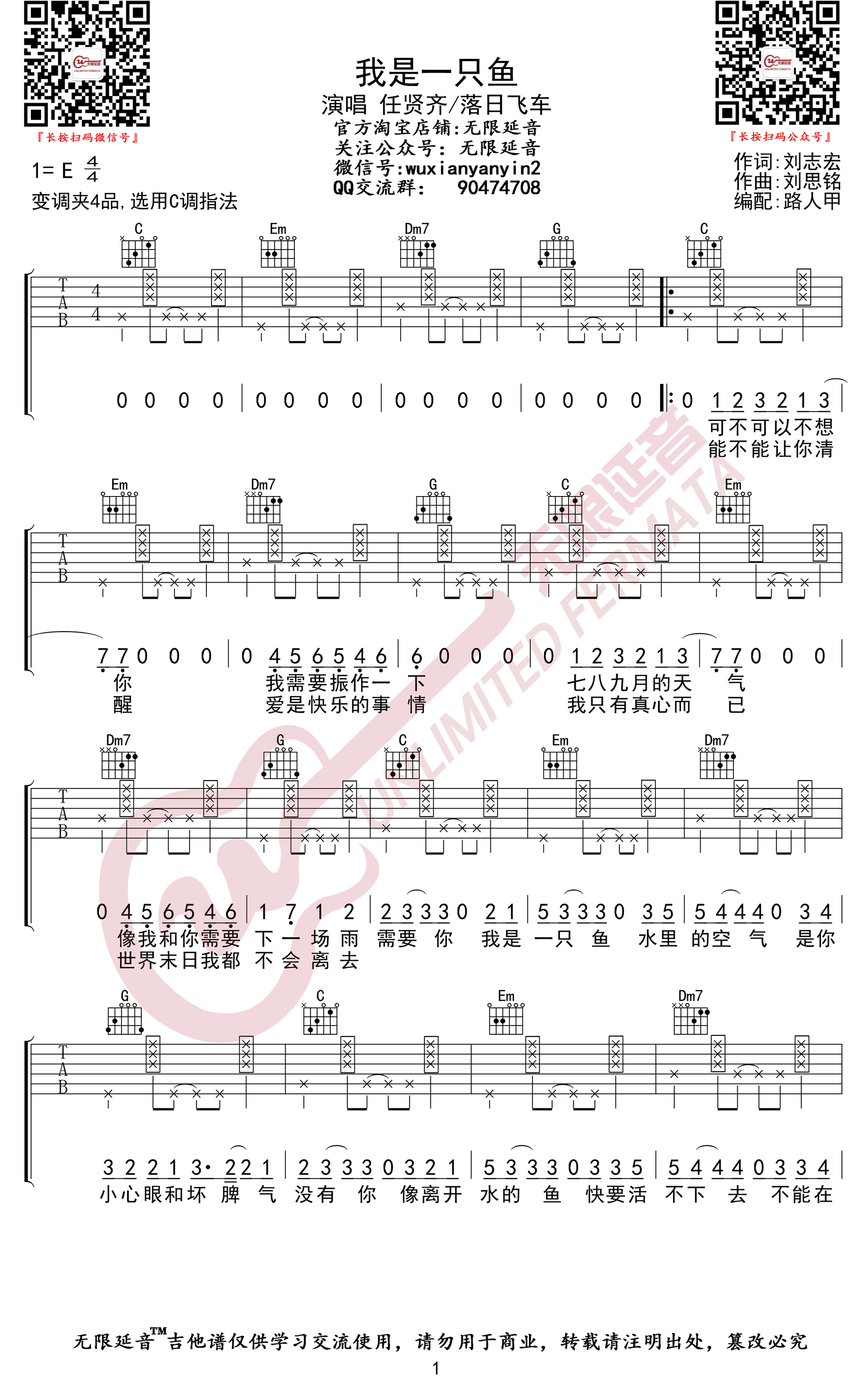 我是一只鱼吉他谱 - 落日飞车/任贤齐 - C调吉他弹唱谱