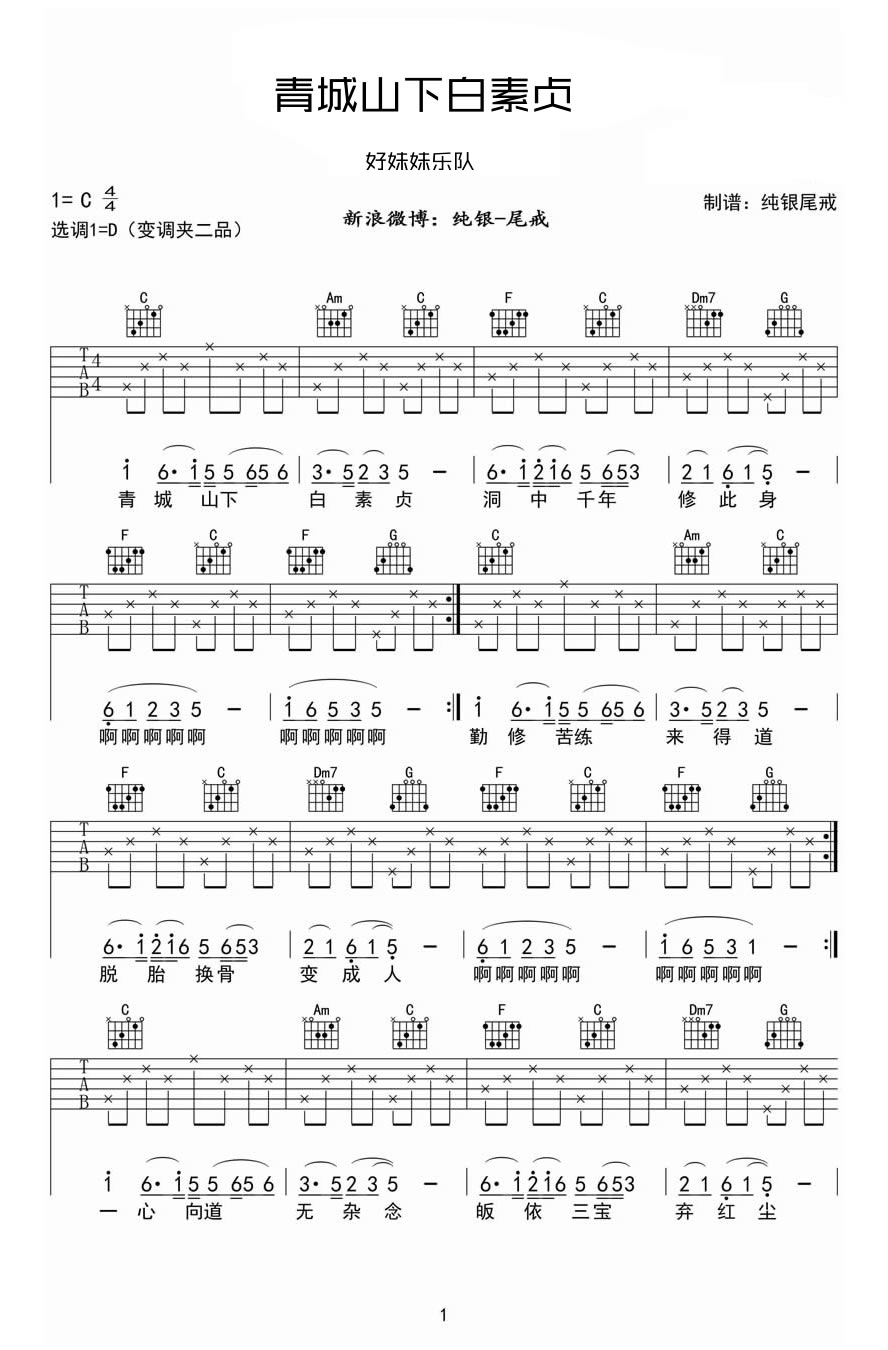 曲谱介绍: 好妹妹乐队《青城山下白素贞》吉他弹唱谱,采用C调指法编配,共有2张高清图谱,免翻页排版设计。