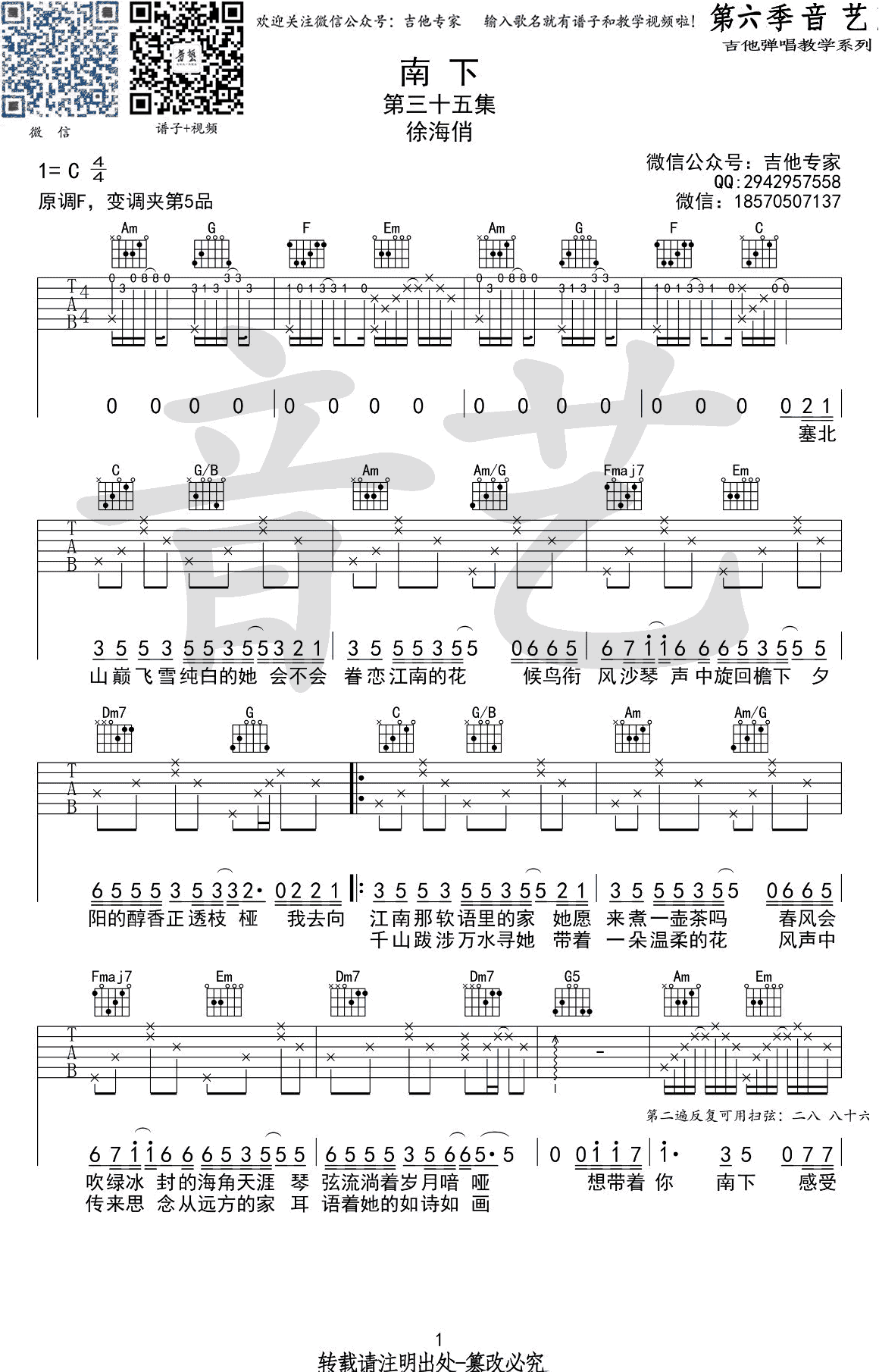 曲谱介绍: 徐海俏《南下》吉他弹唱谱,采用C调指法编配原版,共有2张高清图谱,免翻页排版设计。