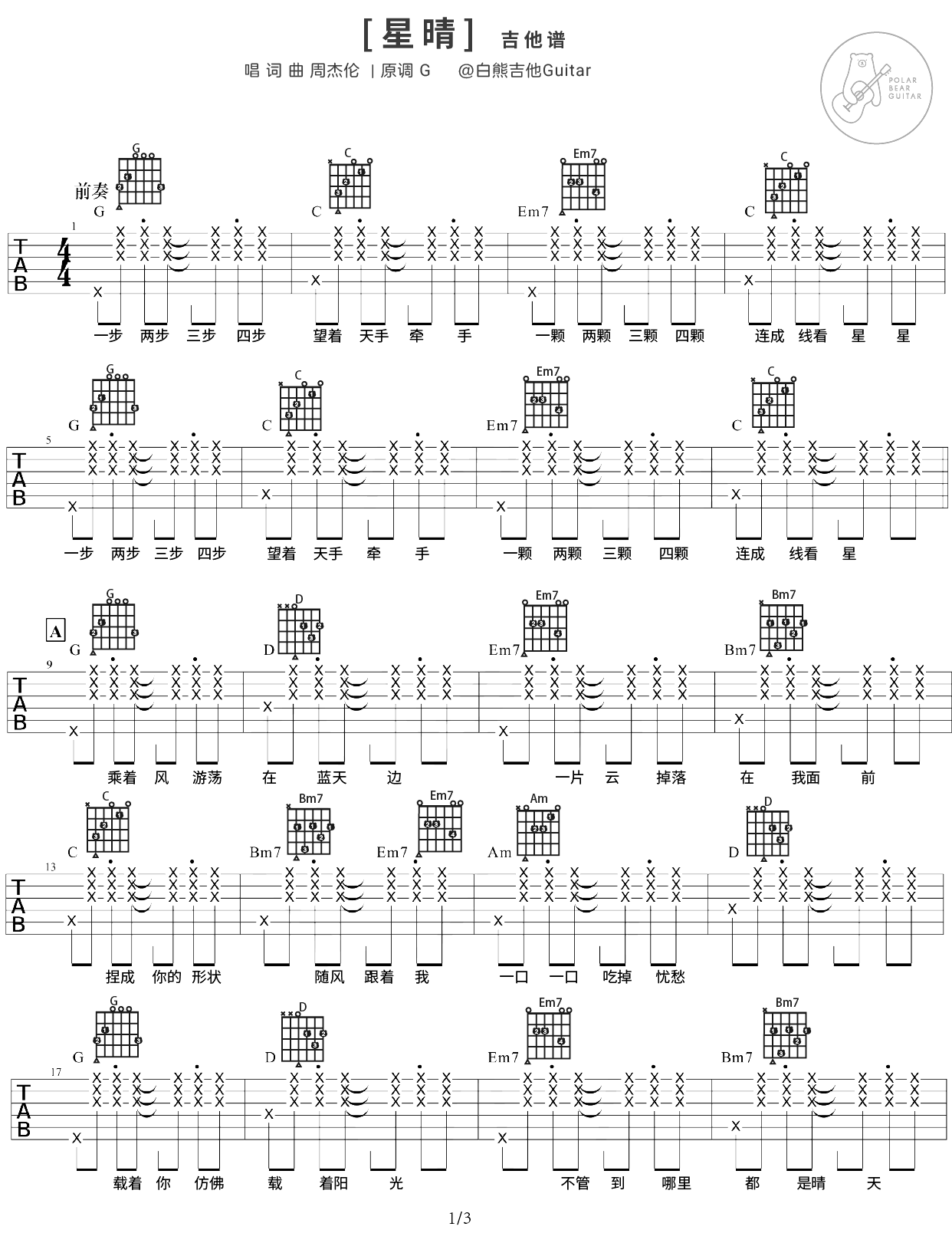 星晴吉他谱 - 周杰伦 - C调吉他弹唱谱