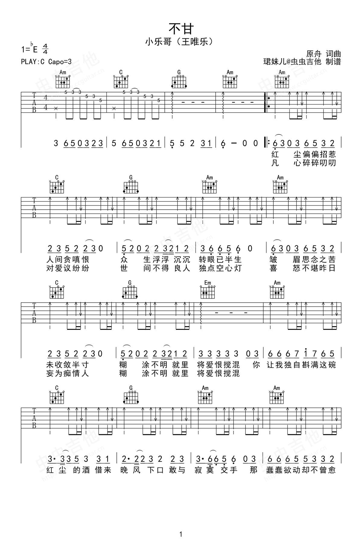 不甘吉他谱 - 小乐哥 - C调吉他弹唱谱